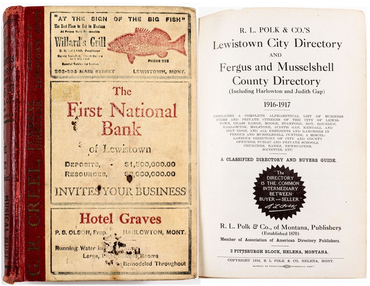 Great resource. Includes counties Fergus, Mussellshell and Judith Gap and advertising for towns like Lewistown, Benchland, Buffalo, Coffee Creek, Denton, Grass Range, Hobson, Moccasin, Stanford, Roy, Winifred, Roundup, Ryegate, Harlowtown, etc. Cover has detached. Pages all still attached, but starting to detach. Still a nice reference book. City: Lewistown State: Montana Date: 1916 ID: 31018