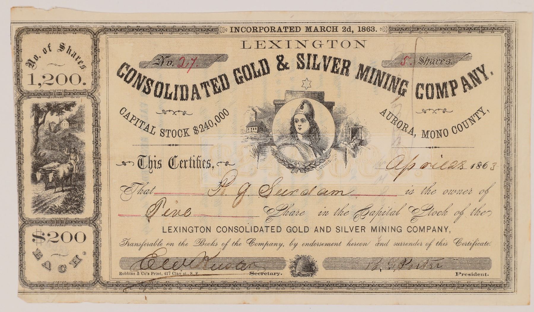 Located on Last Chance Hill, Aurora, Mono County. Technically this is a Nevada territorial stock, though Aurora was in California at this time. Early certificate No. 27 for five shares issued to R. G. Surdam on April 28, 1863. Signed by Secretary E. W. Kuster and President B. F. Porter. Not cancelled. Black print on creme paper with black border; yellow underprint "240,000". Printed by Robbins & Co. Print, 417 Clay St. San Francisco. Measures 9.75 x 5.5". Vignette of woman at center by Loomis and vignette at left a man with a team of oxen. Rare. In the early days of the Comstock, Harvey Harris, a well-known assayer in California with offices in San Francisco, Sacramento and Marysville was busy scouting new locations for expanding his assaying business in the Nevada Territory. Aurora was on the border with California and was county seat to both Mono County, CA and Esmeralda County, Nevada Territory. In late 1864, after the boundary survey prior to Nevada statehood in October of 1864, Aurora was firmly identified as part of Nevada. Harris opened up branch offices first in Aurora (June 5, 1861) and then Carson City in the Nevada Territory by the late summer of 1861. He hired Ernst (Edward) W. Kuster--the E.W. Kuster that signed this stock-- to head his branch assay office in Aurora and later sold out to him. Later consolidated by the Real del Monte Mining Company, which took over the highly productive "old" Aurora claims on Last Chance Hill in 1877. [Ref: EMJ, Vol. 27]