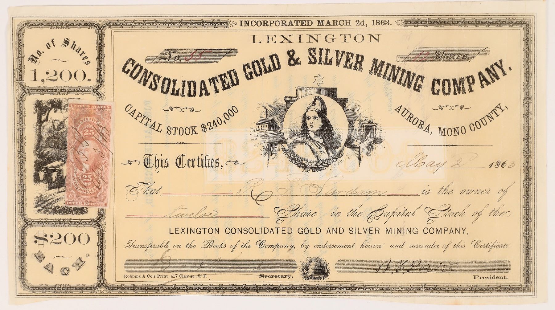 Located on Last Chance Hill, Aurora, Mono County. No. 55 issued for five shares issued to R. G. Surdam on May 2nd, 1863. Signed by Secretary E. W. Kuster and President B. F. Porter. Not cancelled. Black print on creme paper with black border; yellow underprint "240,000". Printed by Robbins & Co. Print, 417 Clay St. San Francisco. Measures 9.75 x 5.5". Vignette of woman at center by Loomis and vignette at left a man with a team of oxen (partially covered by 25 cent US IR Warehouse stamp). Rare. In the early days of the Comstock, Harvey Harris, a well-known assayer in California with offices in San Francisco, Sacramento and Marysville was busy scouting new locations for expanding his assaying business in the Nevada Territory. Aurora was on the border with California and was county seat to both Mono County, CA and Esmeralda County, Nevada Territory. In late 1864, after the boundary survey prior to Nevada statehood in October of 1864, Aurora was firmly identified as part of Nevada. Harris opened up branch offices first in Aurora (June 5, 1861) and then Carson City in the Nevada Territory by the late summer of 1861. He hired Ernst (Edward) W. Kuster--the E.W. Kuster that signed this stock-- to head his branch assay office in Aurora and later sold out to him. Later consolidated by the Real del Monte Mining Company, which took over the highly productive "old" Aurora claims on Last Chance Hill in 1877. [Ref: EMJ, Vol. 27] Aurora Nevada Franklin Collection
