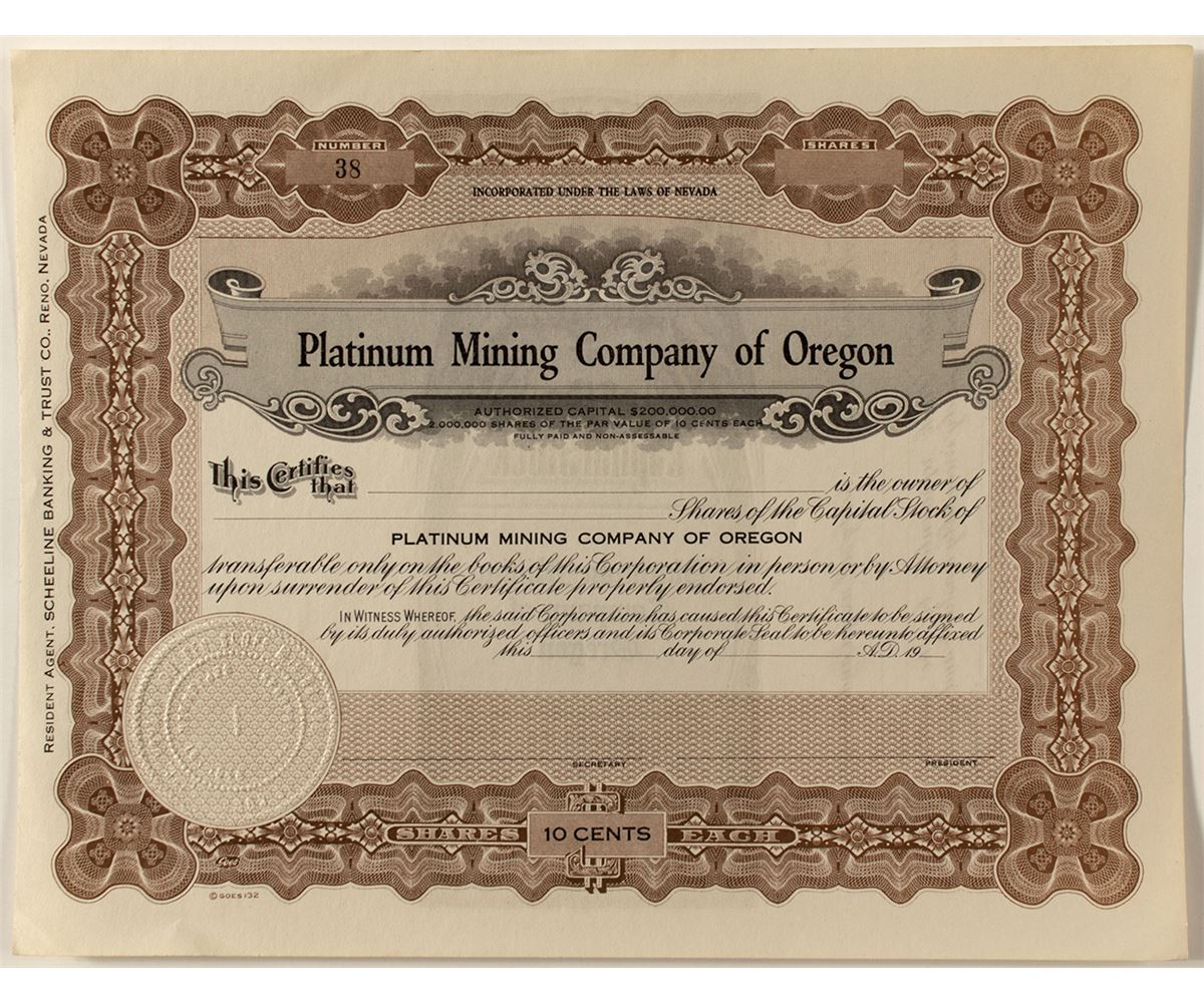 Stock certificate (uncancelled) for 45 shares of a working Mine in Spruce Gulch, Lawrence County. Certificate #1108, issued to W.C. Parsons, signed by Chas E. Whiting VP and Henry F. Wells, Treasurer. Great vignettes, excellent condition.