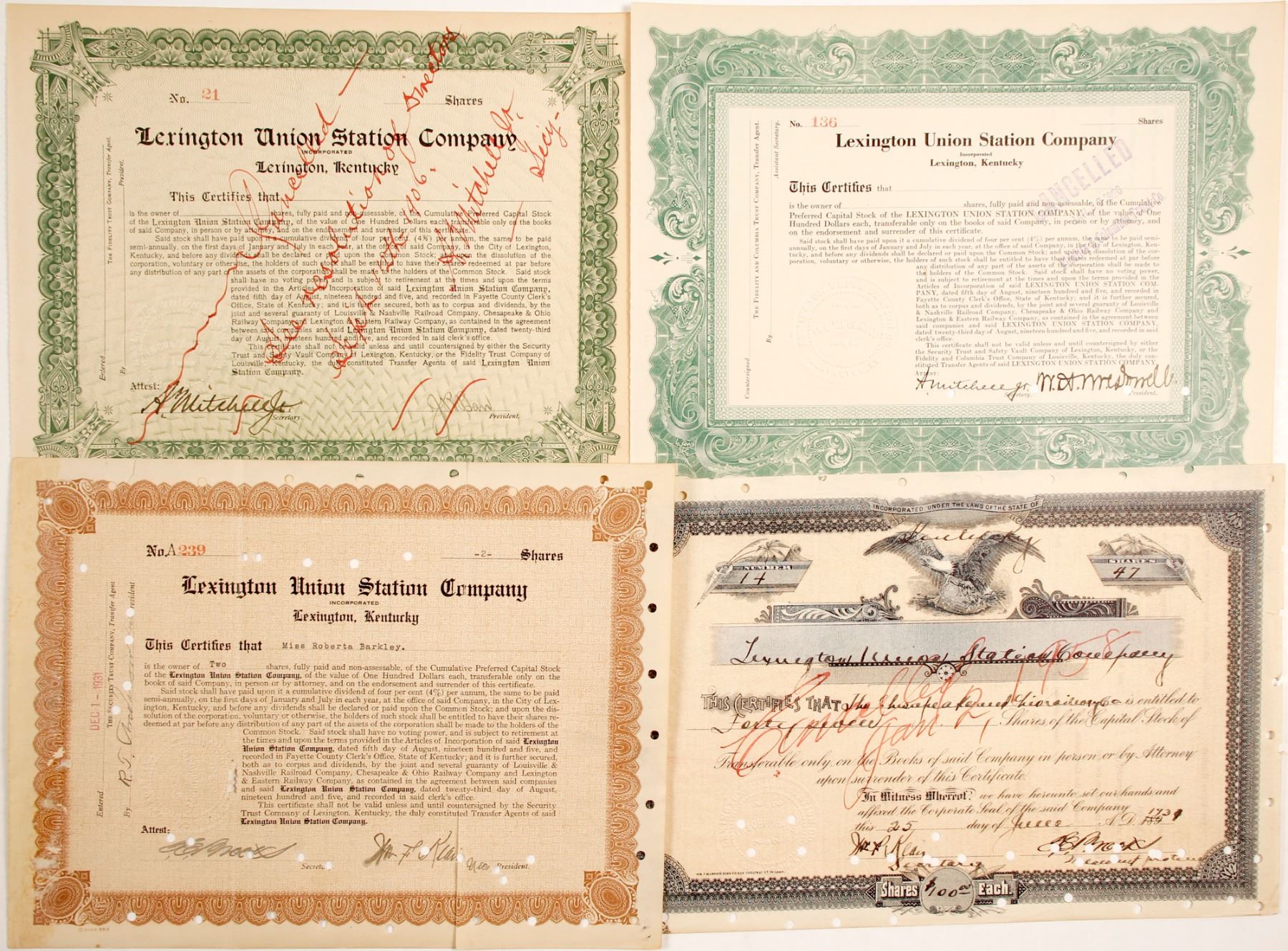 All I/U. #239 Roberta Barkley 2 shares 1931-2" and .5" tears, #21 canceled, #136 unissued, #14 Cheseapeake RR Co 47 shares 1931. Ken Prag Collection
