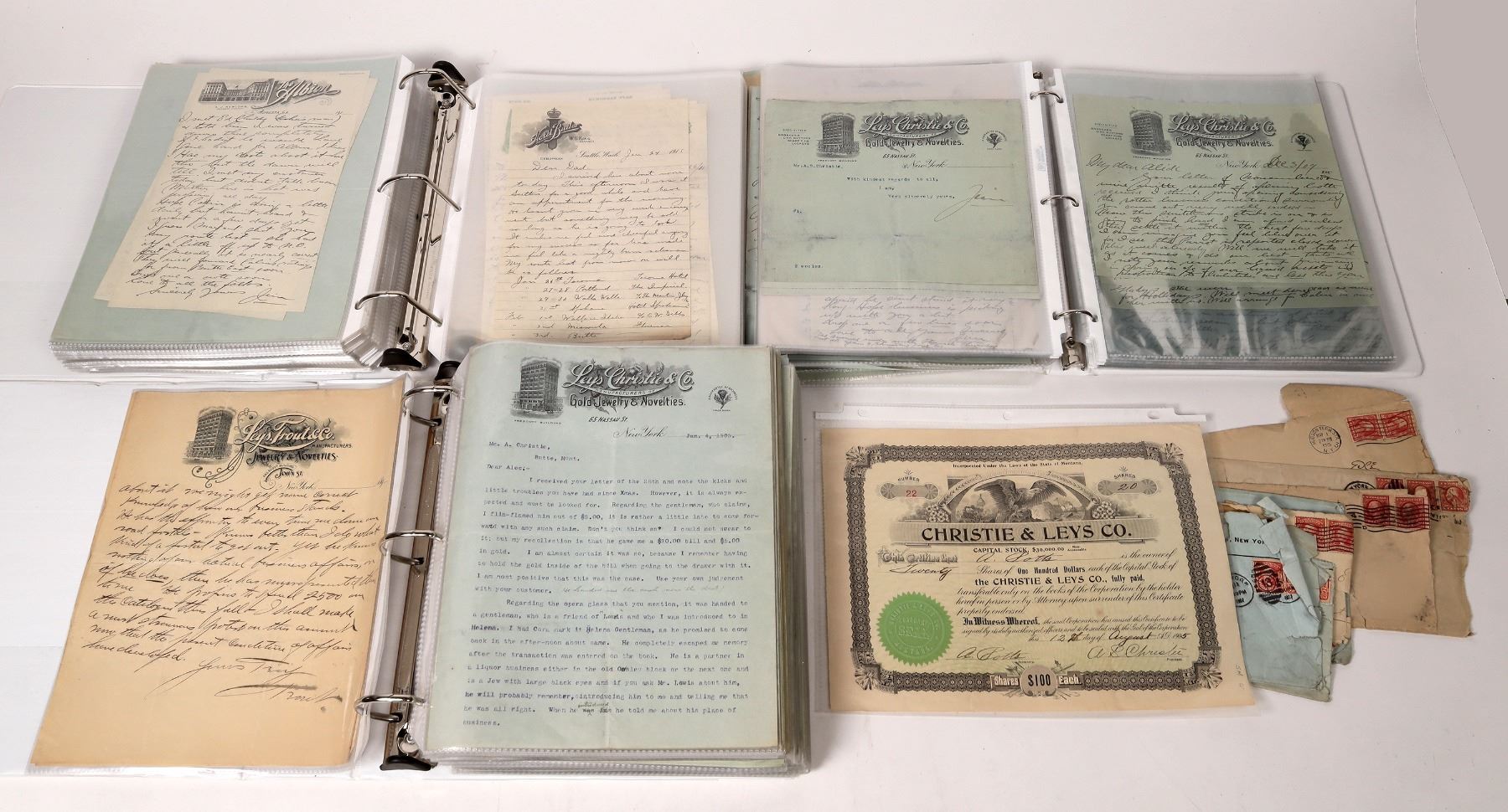 Archive of Ley's, Christie & Co. Jewelry c. 1898-1921, across multiple stores. Included lots of correspondences with multi page letters and a few covers. Interesting archive of the working of a jewelry business. 1 stock certificate, 1905. New York Stuart Mackenzie Montana Ephemera Collection