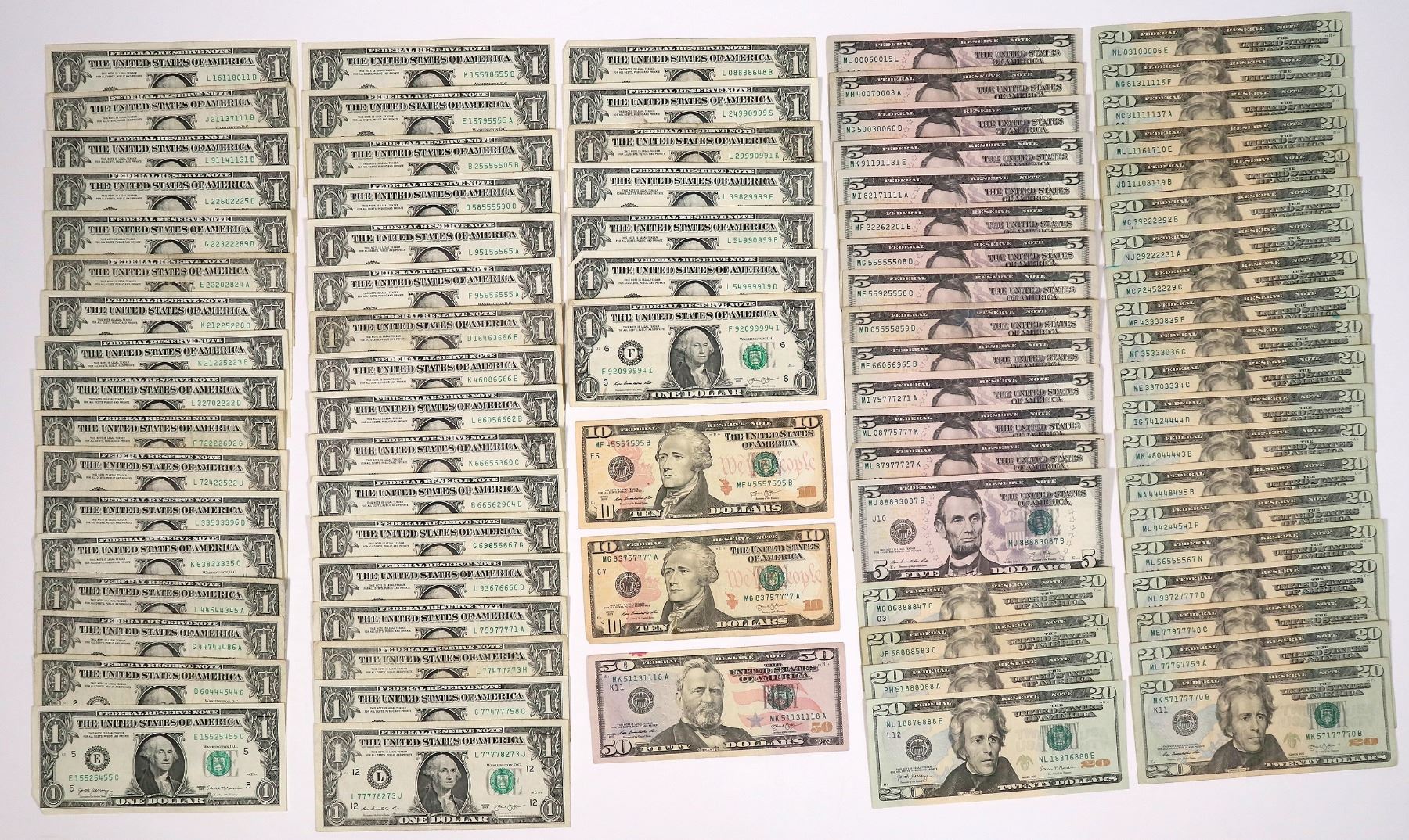 Liar's poker is an American bar game that is played with the eight digits of the serial number on U.S. currency. The digits are usually ranked with the 1 as "ace" as the highest value, followed by 0 as "10", down to 2 as the lowest. Each player holds one bill, unseen by the other players. Each guess or bid must be higher in quantity, or equal in quantity but higher in value, than the previous bid. The game continues until somebody thinks the prior player is lying and calls the bluff. If correct, the one who called the bluff wins; if not the player who proposed the sequence wins. This collection of U.S. currency will give you an advantage as each note has at least five of a kind in its serial number. $1 bills (41); $5 (14); $10 (2); $20 (24); $50 (1). For a total face value of $661. Good luck.