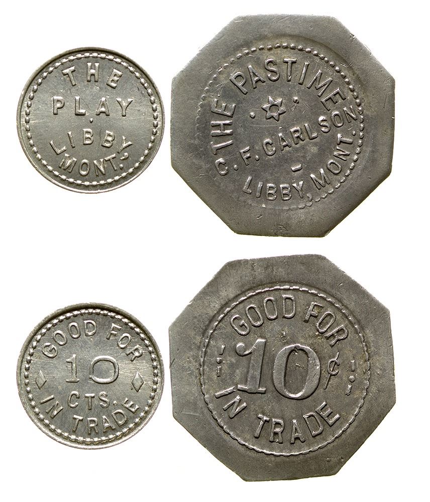 1] The / Play / Libby / Mont. // GF / 10cts / IT. 18mm 2] The Pastime / C F Carlson / Libby, Mont. // GF / 10c / IT. Both R-7, 18mm (Svoboda Collection) City: Libby State: Montana Date: HWAC# 35958