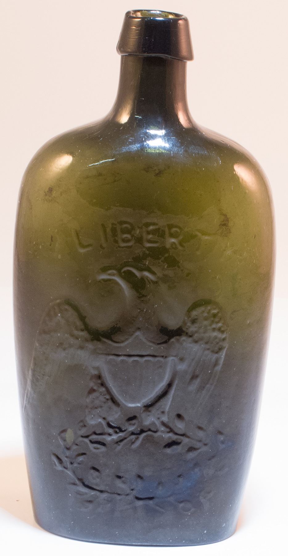 A rare variety of the popular Wlillington Liberty Eagle whiskey flask in dark green, flat base, circa 1860. 8" tall. Slope top, applied, all striations still present (not buffed). Sparkling clean and mint, with no apparent chips or dings. This is a beauty, a perfect bottle for your collection. State: Connecticut City: West Willington HWAC#: 40879 Date: