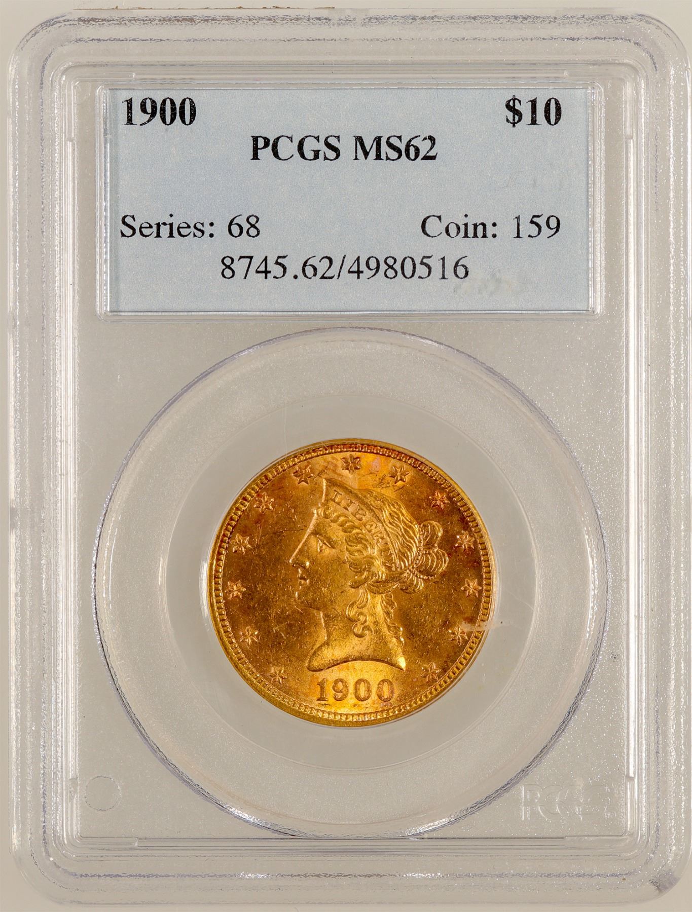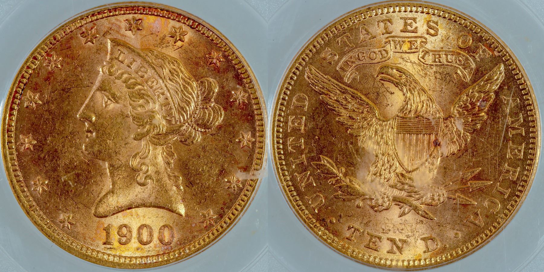 PCGS certified MS 62 Liberty Head $10 gold piece. Small spot on eagle's breast.