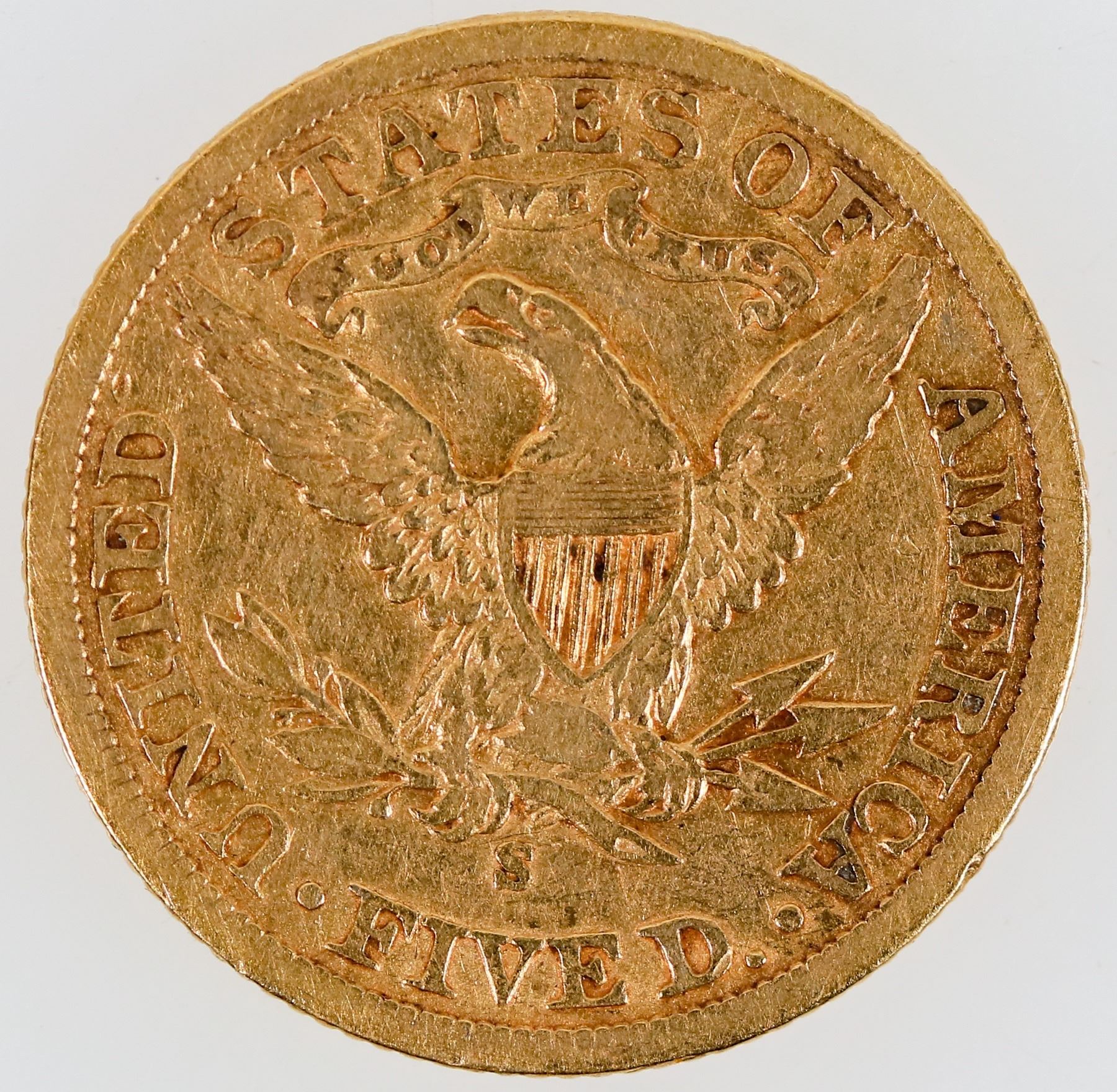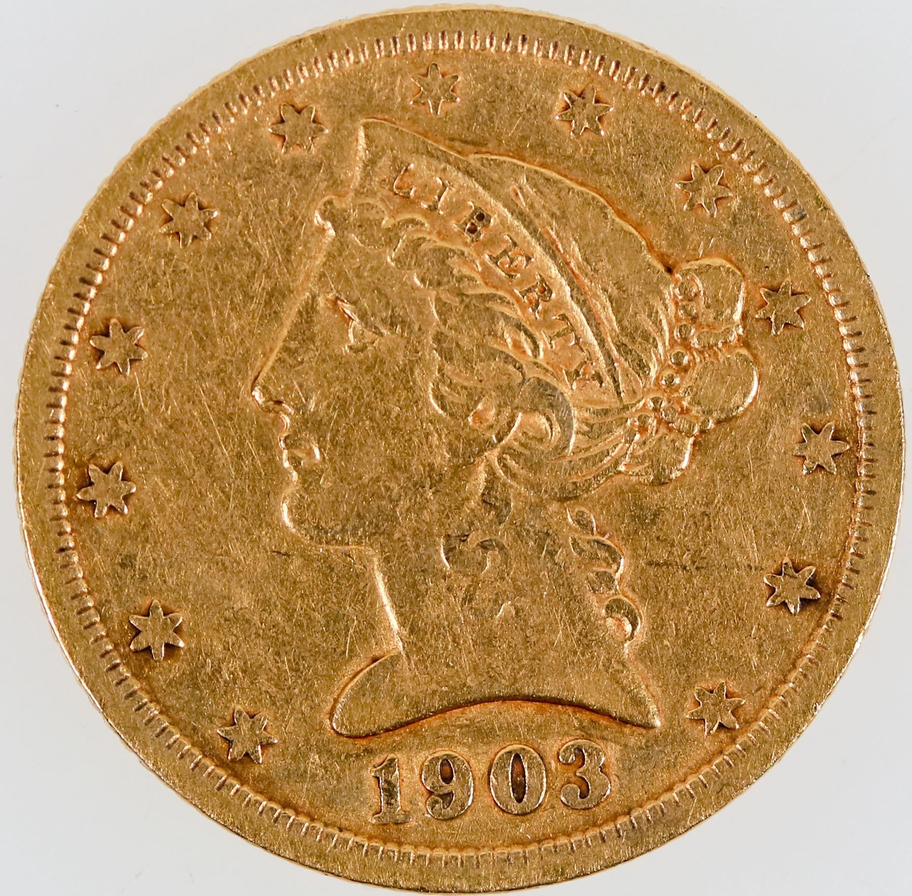 Liberty head $5 gold piece: 1903-S. Very fine condition. Mintage 1,855,000.