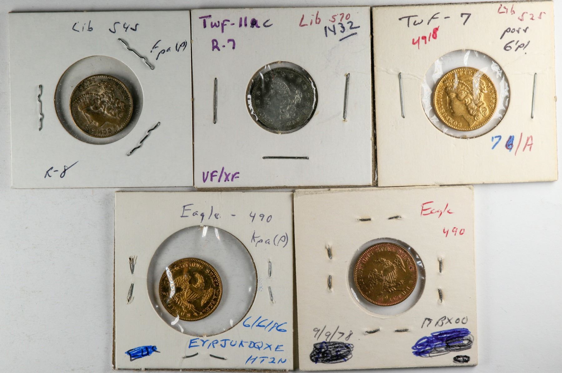 Lot of five Liberty head spiel markes, eagle reverse. Three gold plated, two white metal. 18 mm. Nice EF-AU condition, none holed.