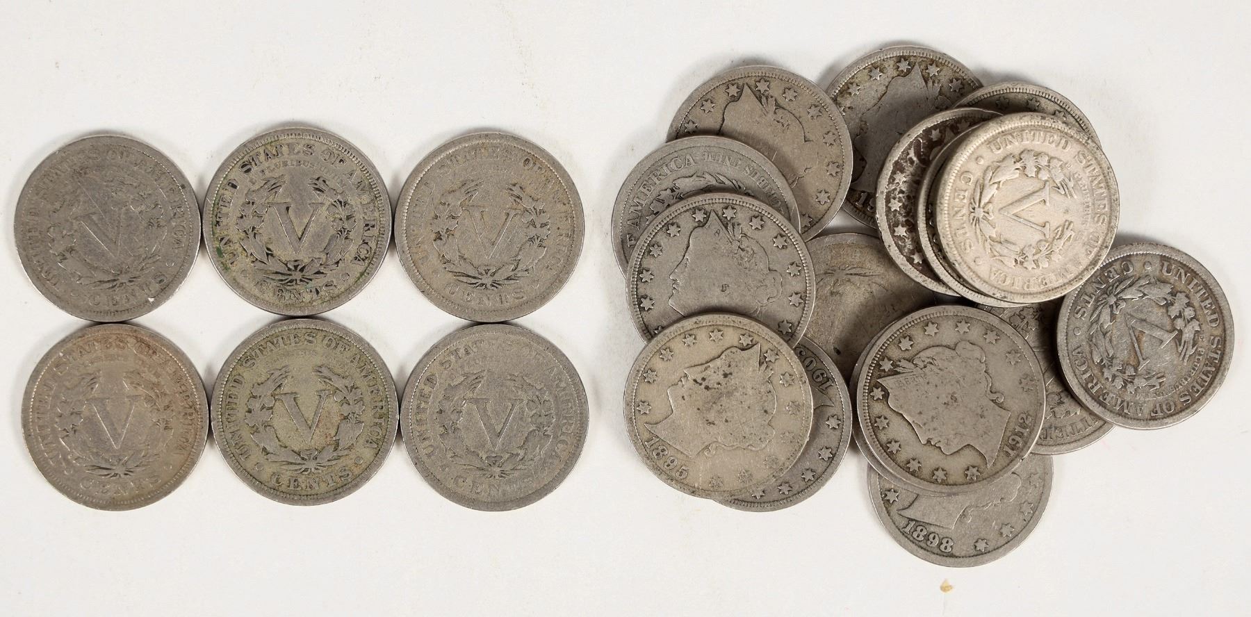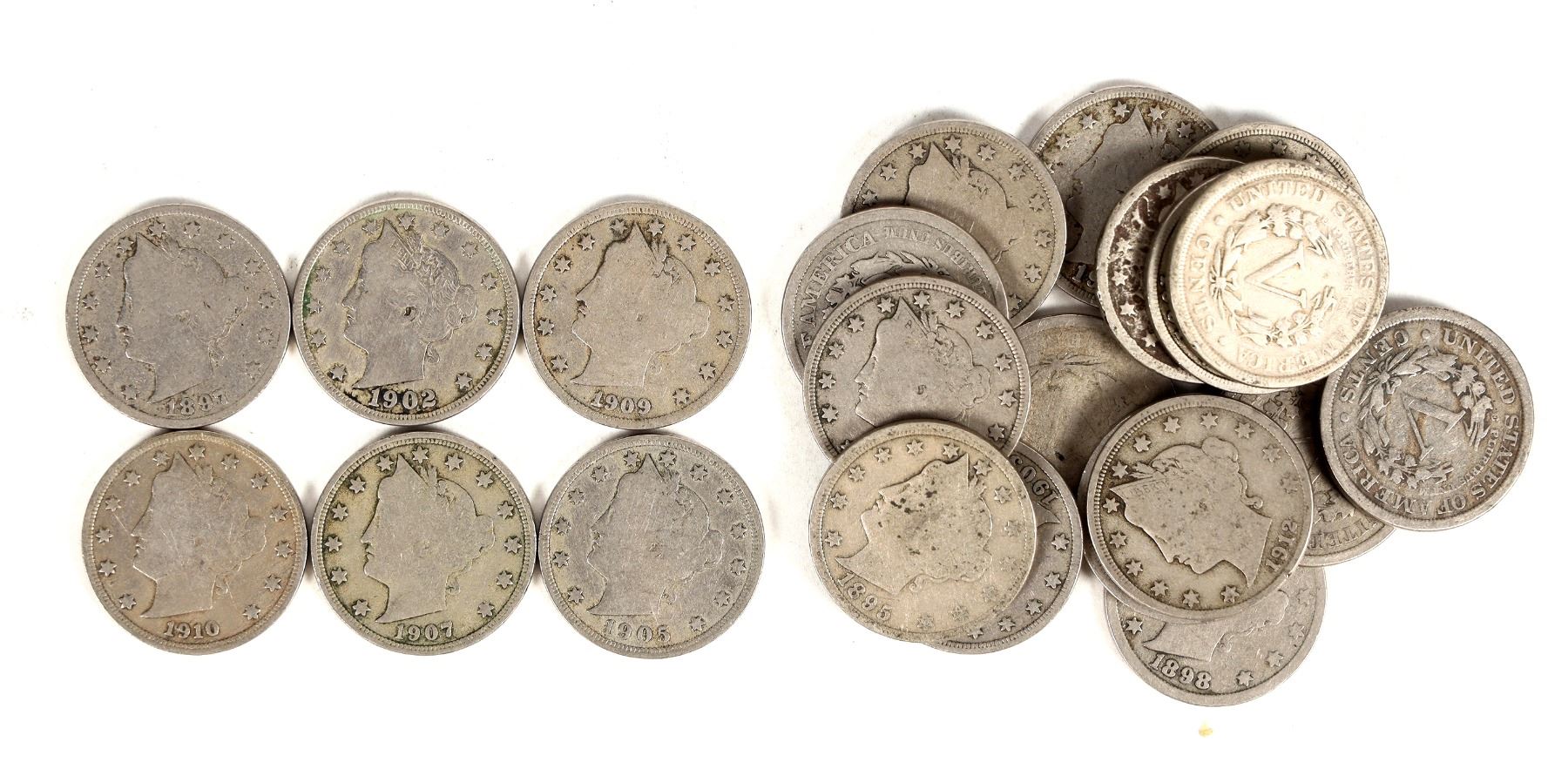 Liberty head nickels: 1883, 1890, 1891, 1892, 1895, 1897, 1898, 1899, 1900, 1901, 1902, 1903, 1904, 1905, 1906, 1907, 1908, 1909, 1910, 1911, 1912, 1912-D. 1900-on all have part of Liberty. Start your coin album here, finish it at your next coin show!