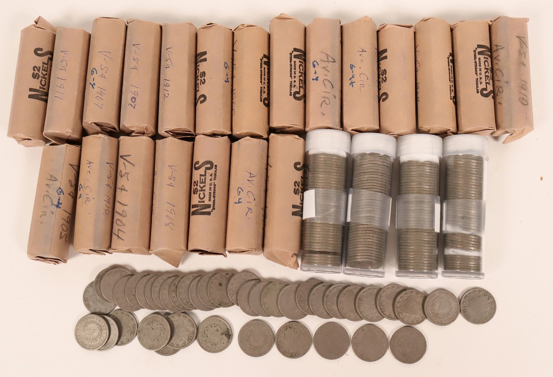 Wooden box with two rolls each of Liberty Head nickels from 1900-1912. Twenty six rolls total, mostly good condition.