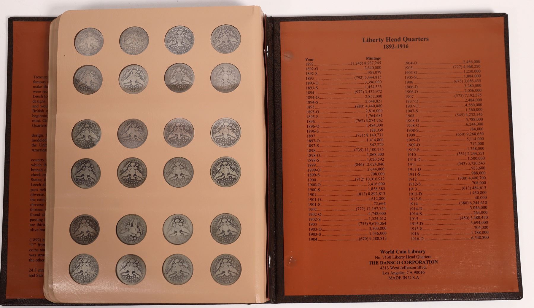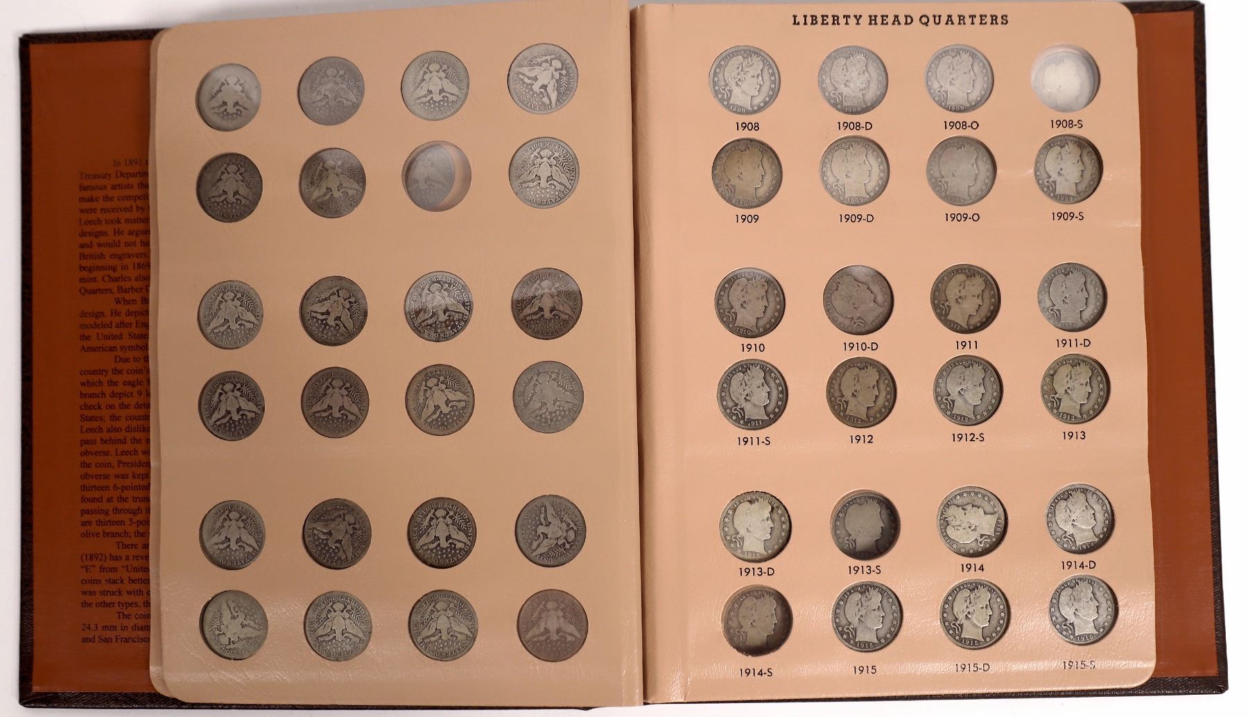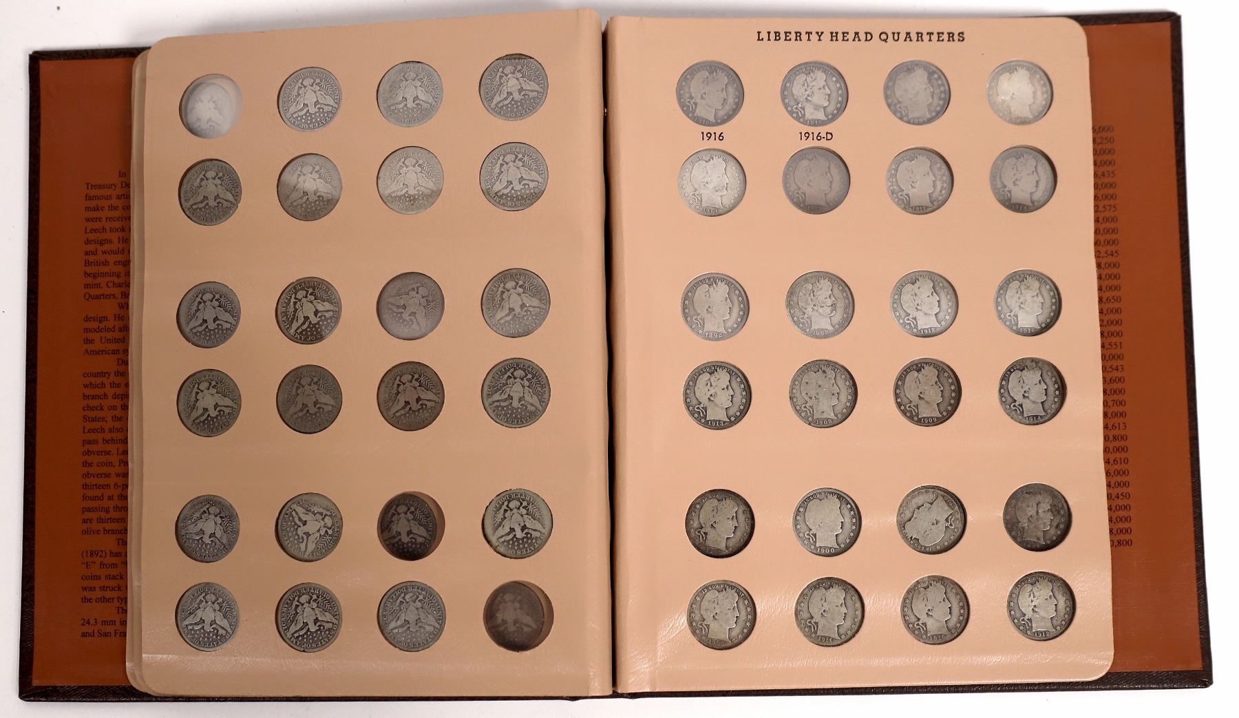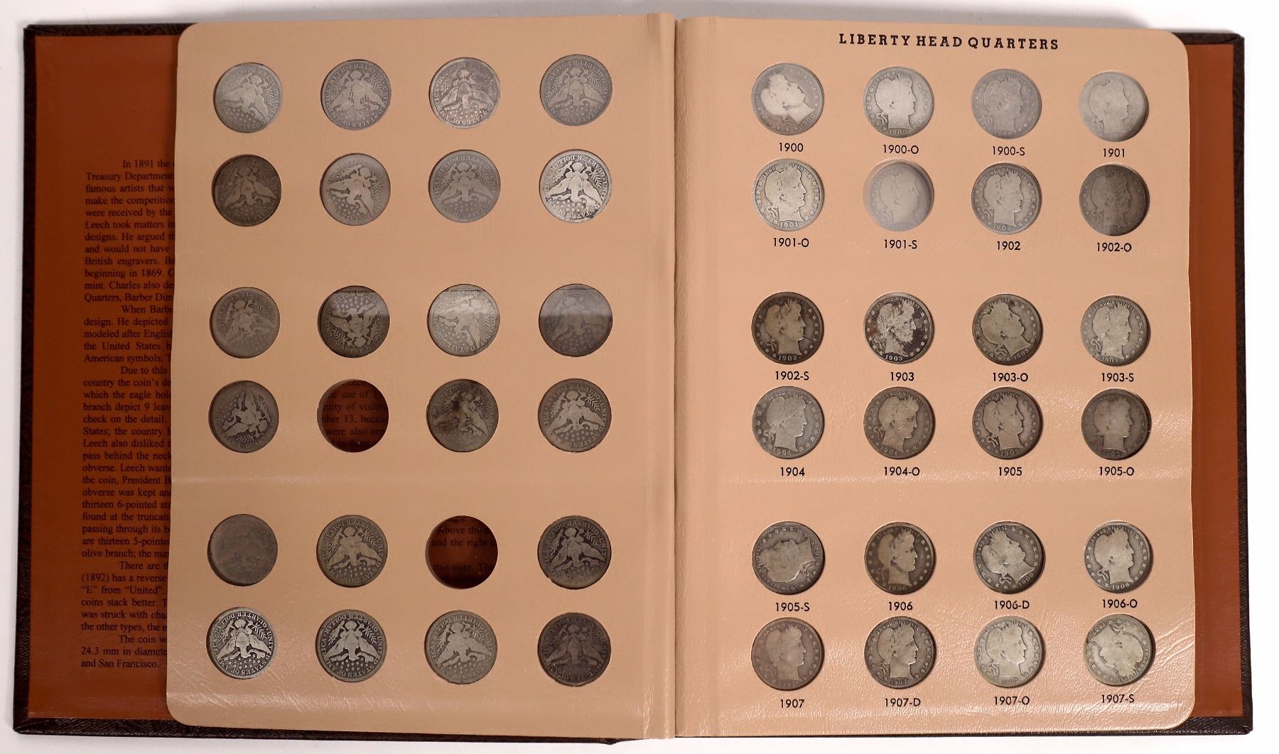 Brown Dansco album No. 7130: Liberty Head (Barber) Quarters 1892-1916 with 84 quarters, 22 additional quarters. Missing 1896-S, 1897-S, 1901-S, 1908-S, 1913-S, 1914-S. Condition AG-F. Dates and mintmarks have not been verified. State: City: Date: Provenance: