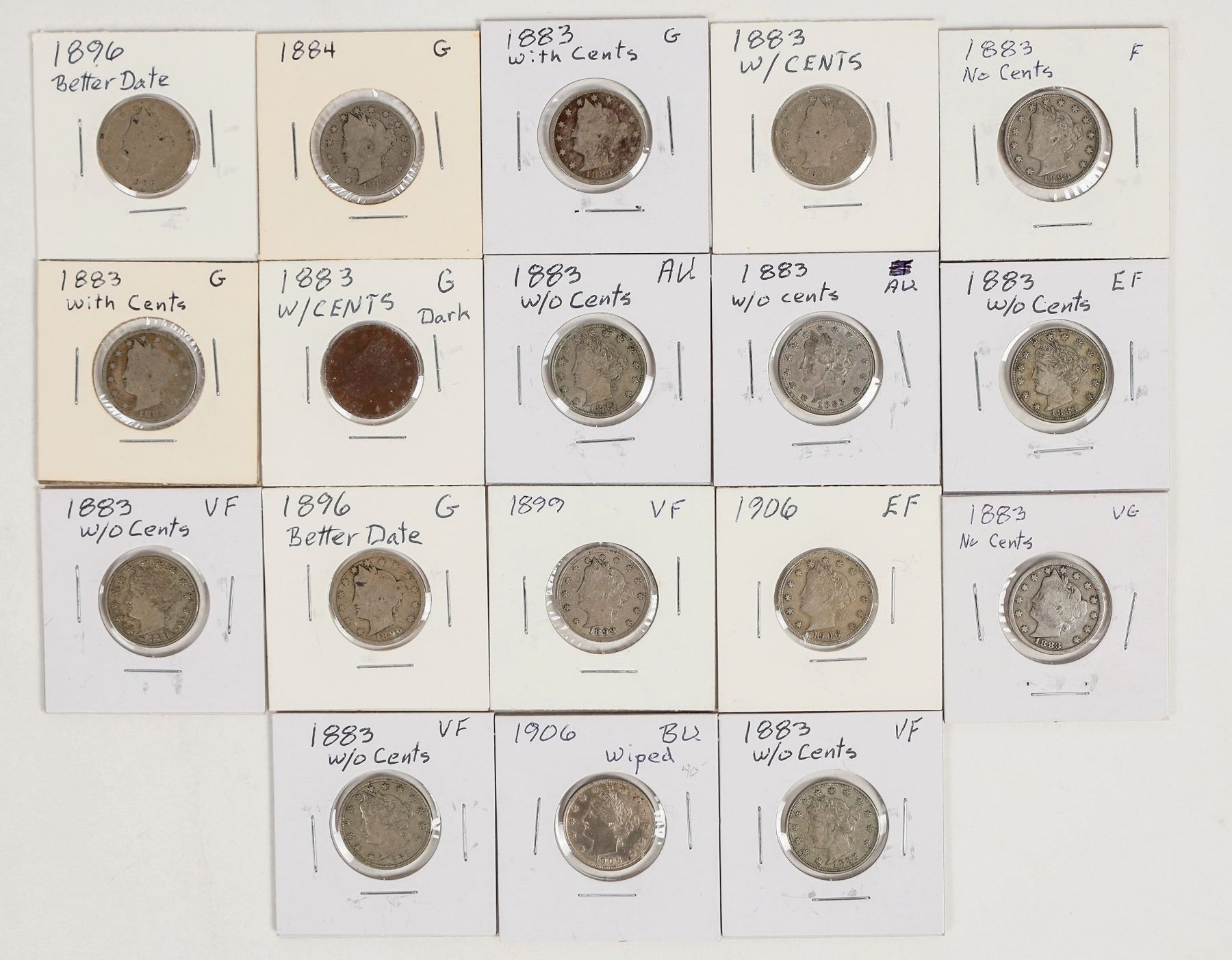 Eighteen Liberty nickels: 1883 with cents (4: G); 1883 no cents (8: VG, F, VF (3); EF, AU (2); 1884 (G); 1896 (AG); 1896 (G); 1899 (VF); 1906 (2: EF, BU cleaned).