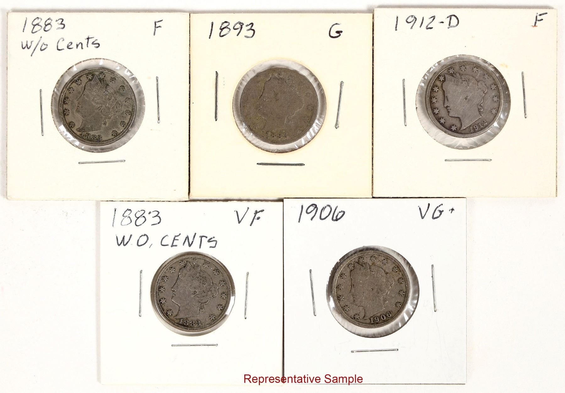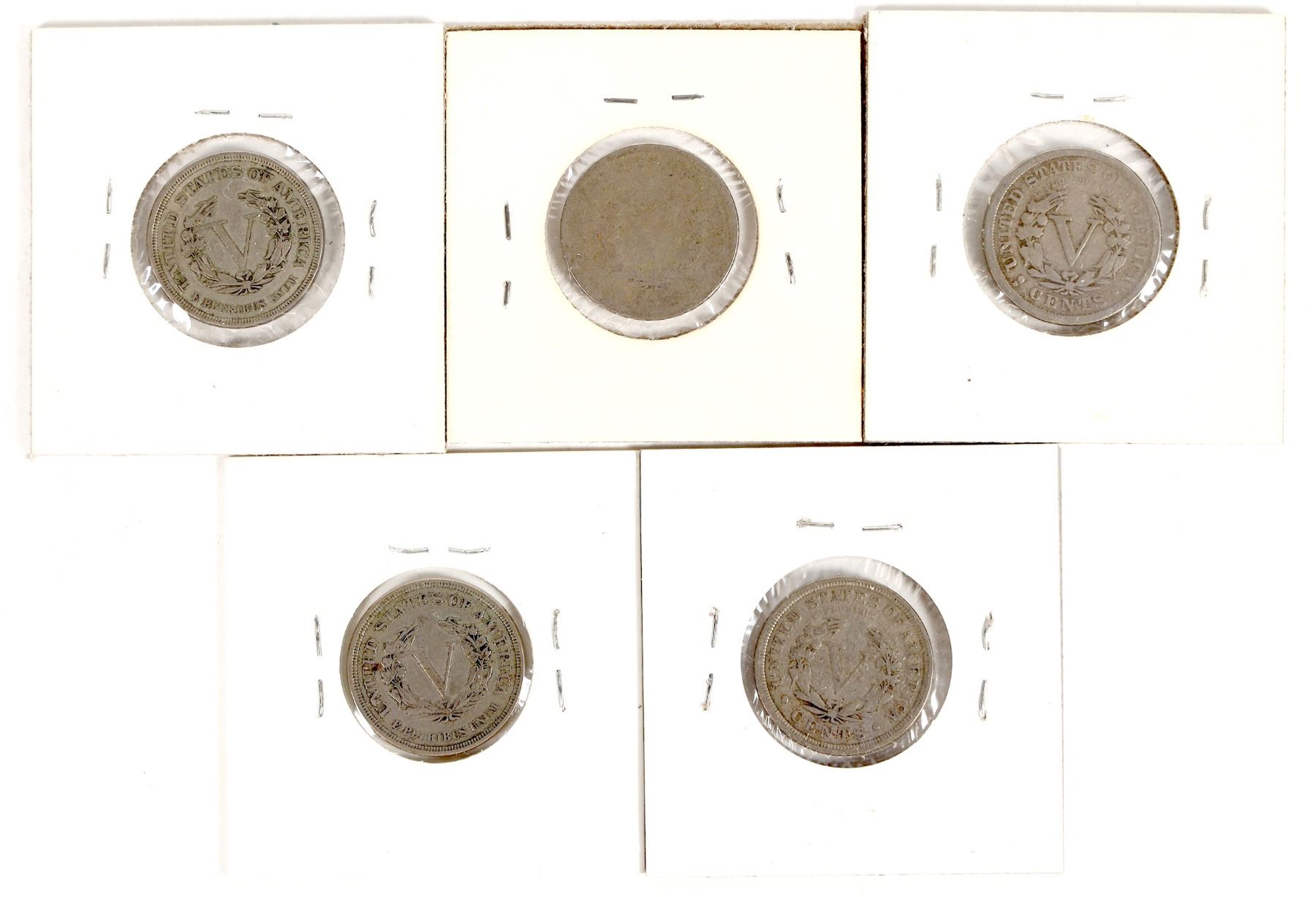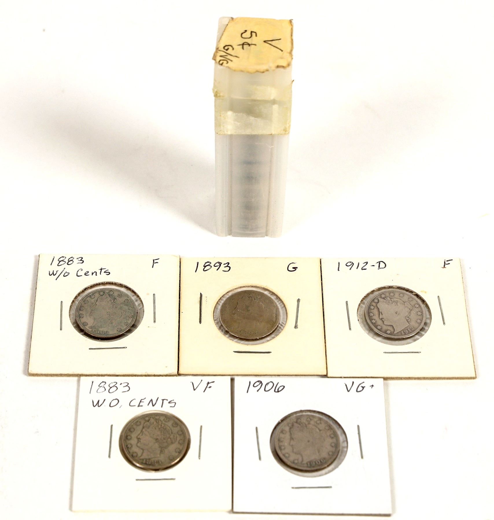 Roll of 40 Liberty nickels in good to very good condition, not checked for dates or mint marks. Plus five: 1883 (no cents) VF, F; 1906 VG; 1912-D F.