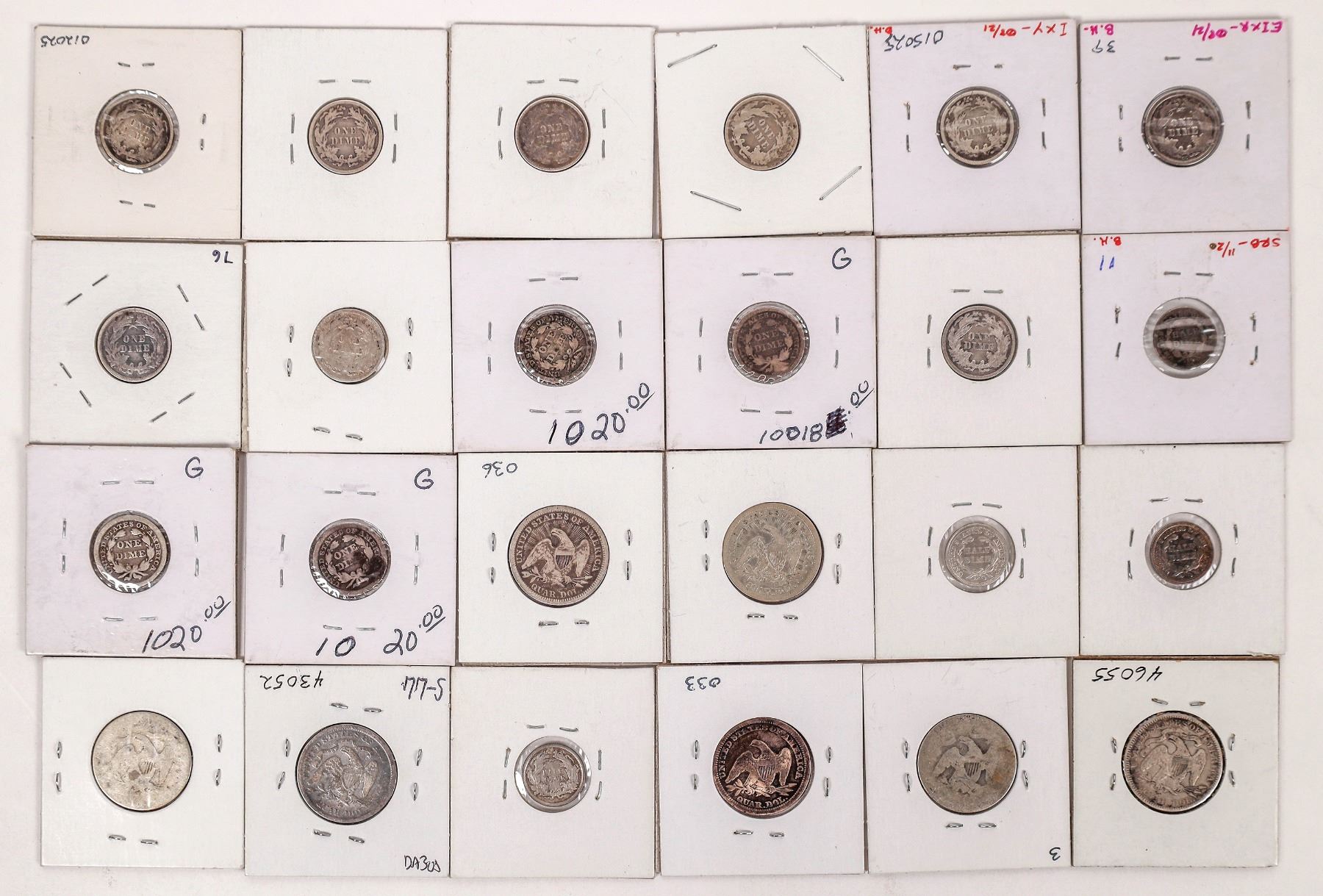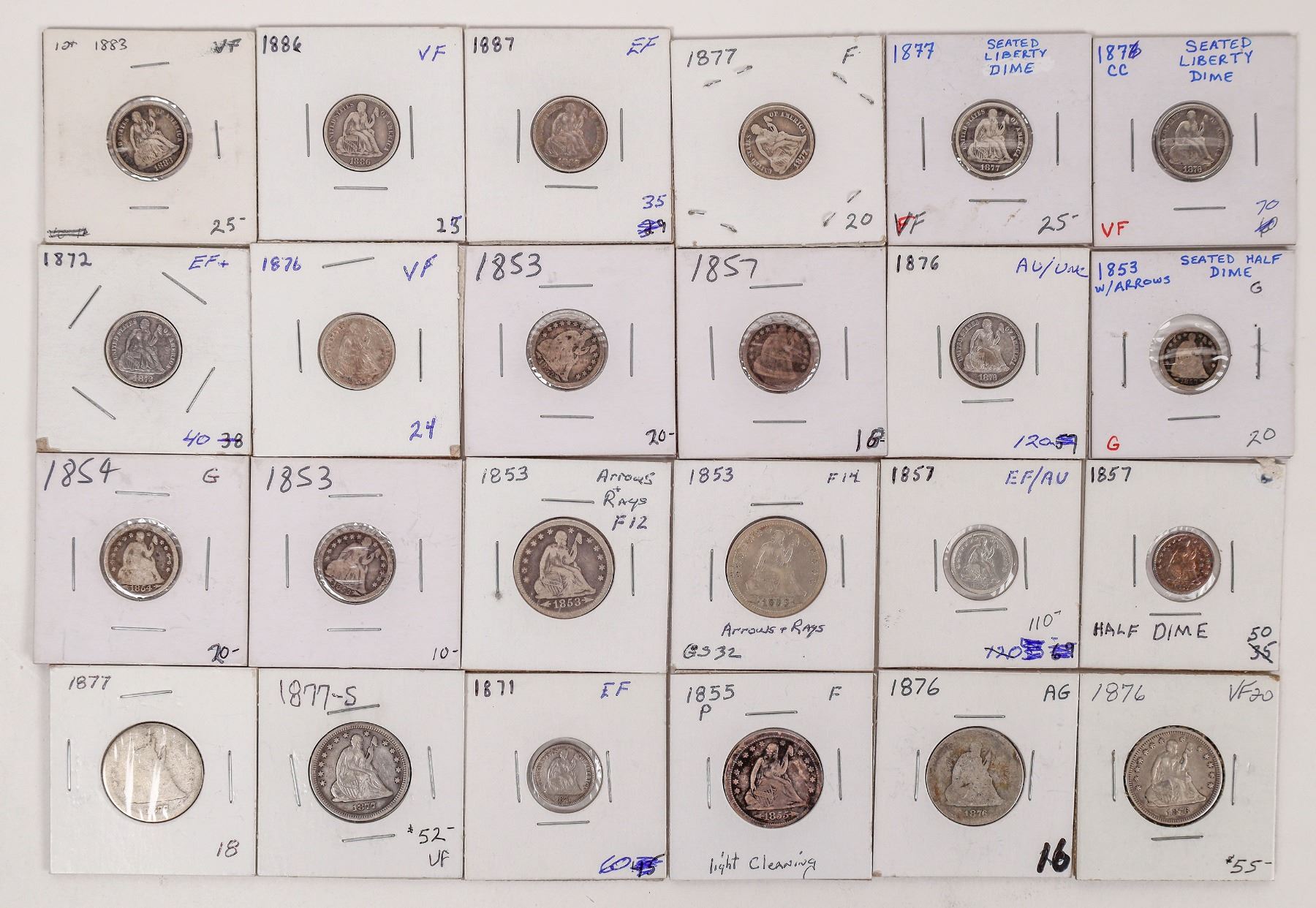 Lot of 24 U. S. Liberty Seated coins. Three half dimes: 1857 (2), 1871. Seven quarters: 1853 (2), 1855, 1876 (2), 1877, 1877-S. Fourteen dimes: 1853 (3), 1854, 1857, 1872, 1876 (2), 1876-CC, 1877 (2), 1883, 1886, 1887. Most are AG-F condition, but several are EF-AU. The Carson City is VF.