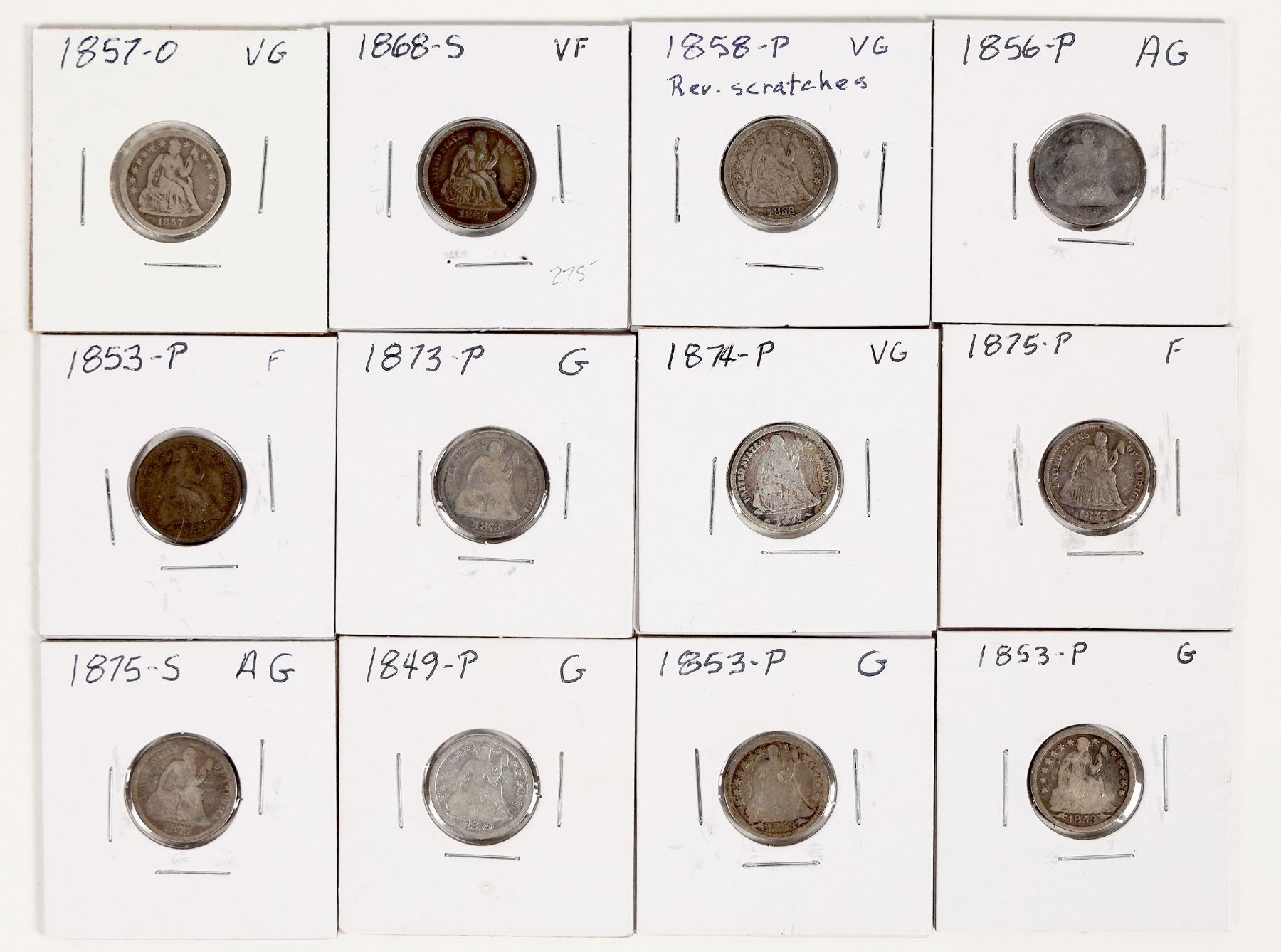 Group of 12 Seated Liberty dimes: 1849 (G); 1853 arrows (3: 2G, F); 1856 (AG); 1857-O (VG); 1858 (VG; scratches on reverse); 1868-S (VF); 1873 (G); 1874 (VG); 1875 (F); 1875-S (AG).