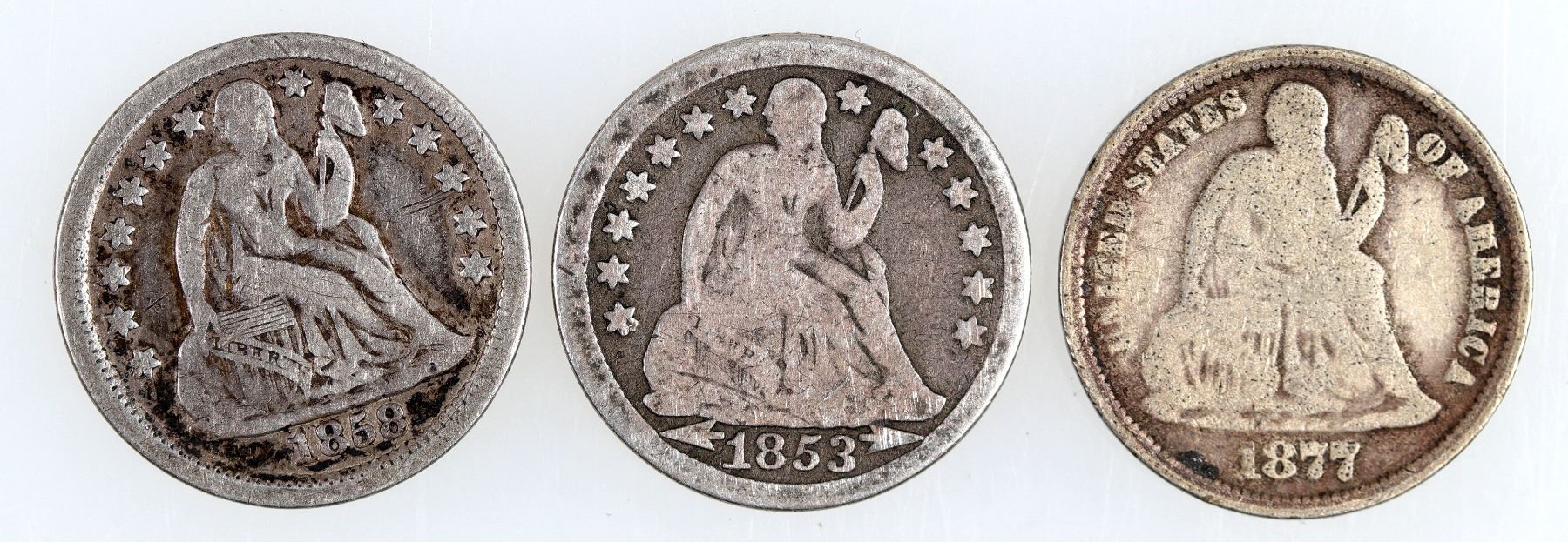 Lot of three Liberty Seated dimes: 1) 1853 w/arrows; G-VG; 2) 1858; F-VF; 3) 1877-CC; G-VG.