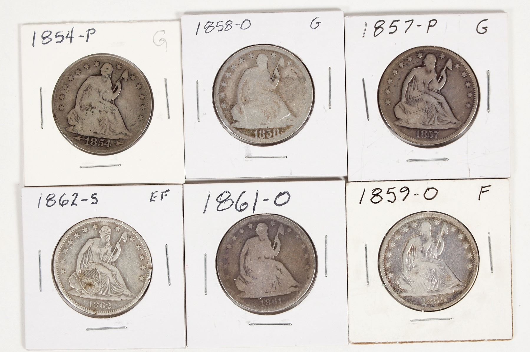 Lot of six: 1854 arrows(G); 1857 (G-VG); 1858-O (G); 1859-O (F); 1861-O (G; tougher date); 1862-S (VF-EF, rim dings).