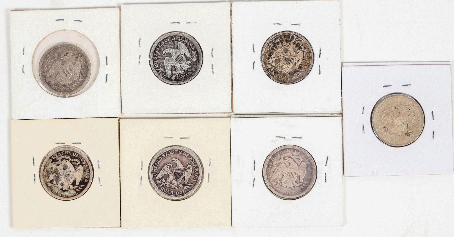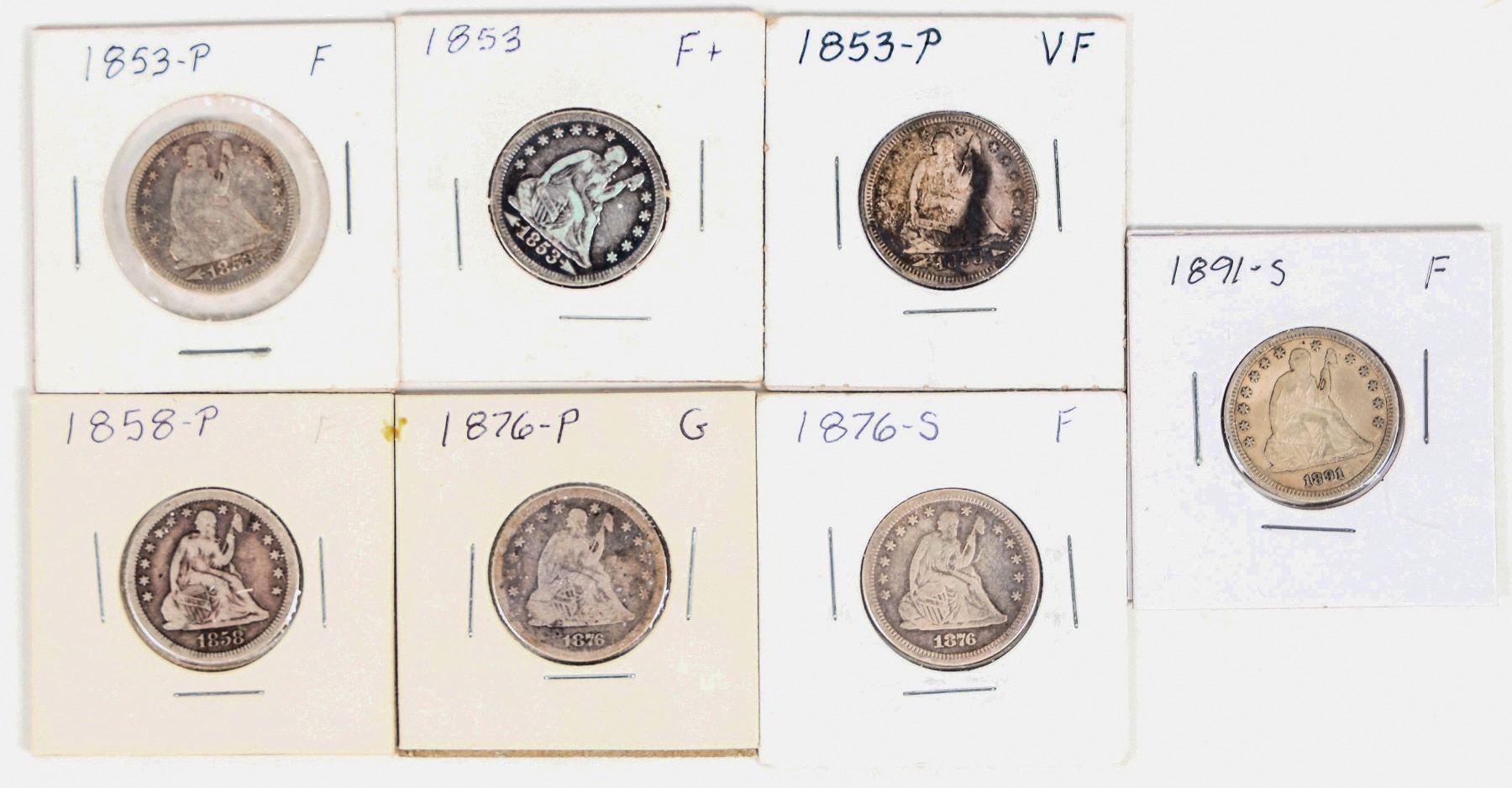 Seven Liberty Seated quarters: 1853 (3: F, F+, VF; 1858 (VG-F); 1876 (G); 1876-S (F); 1891-S (F).