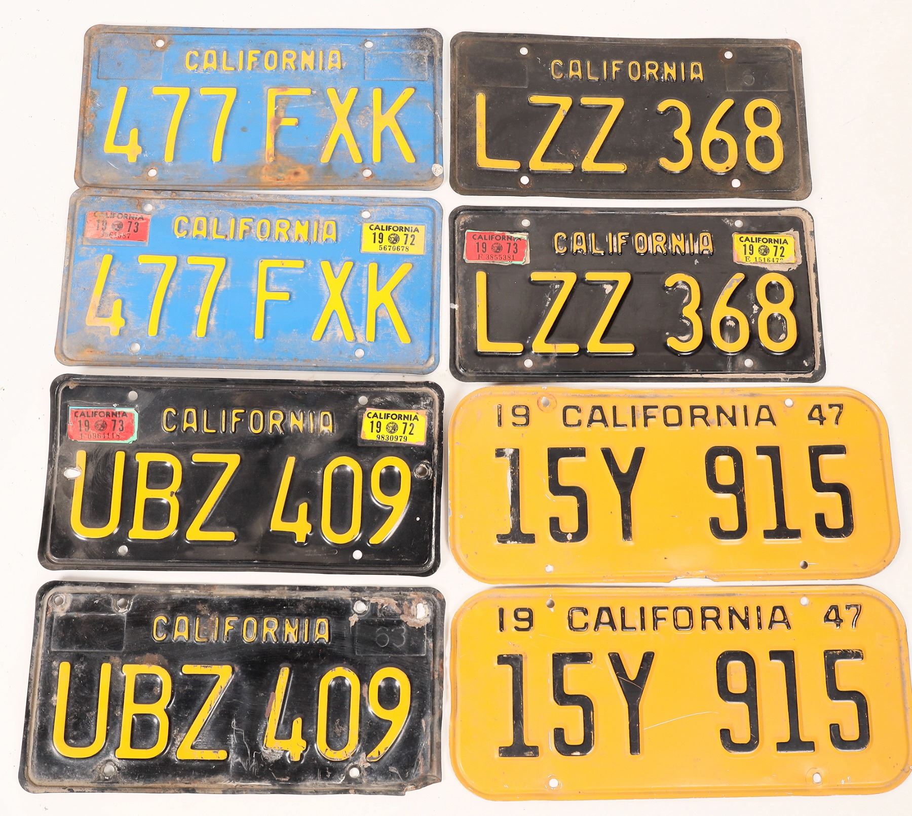 4 matched pairs of California license plates. 1947, 2x 1963-1 pair dented, rough condition. Blue early 1970's. Some rust present, please inspect. California