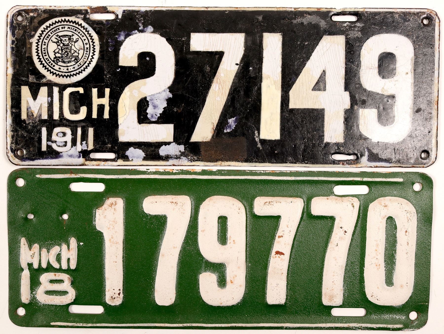 Item # 1 of 2: Embossed with State Seal( Covered with plastic) / Mich/ 1911/ Plate # 27149 // . Black back ground , with white lettering. 4 3/4" high x 12" long.Porcelain plate , which has been partially restored. Some black flaking form the lettering, and front left base area. Reverse , also has some porcelain flaking and rust spots/ Light crazing lines, front and rear of plate. Heavy, 2 lbs or more. Item # 2 of 2: Embossed: Mich/ 18/ Plate# 179770. 4 1/2" high x 12" long. Partially restored. Grass green background, with white lettering. Minute loss to lettering , otherwise nice. Nice pair of early plates. ( RH). Houghton Estate Collection