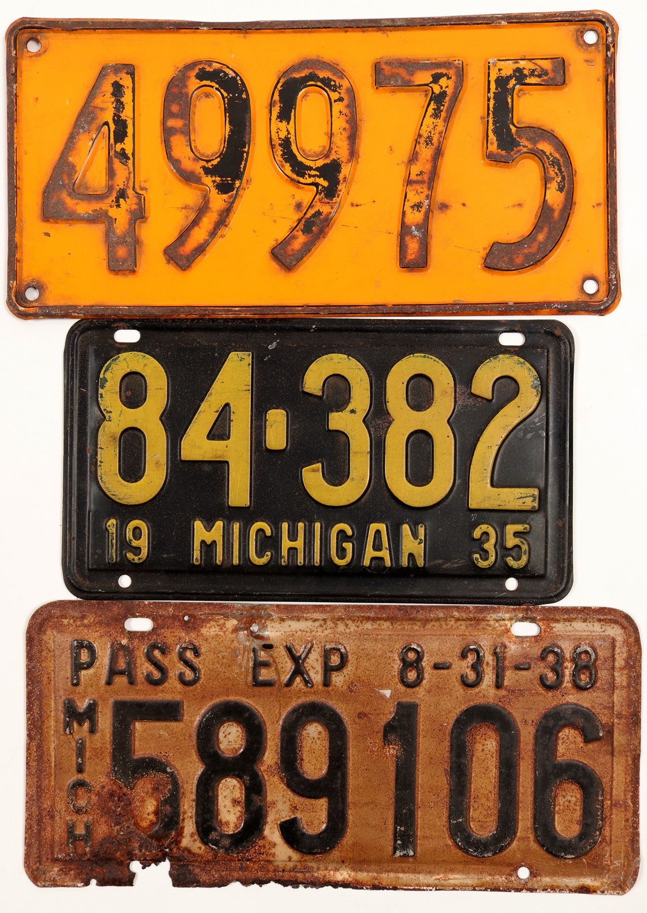 Item # 1 of 3: License plate #84-382 / 19 Michigan 38 //. Black colored plate , with yellow green lettering. 5 1/2" high x 9 7/8" long. Really nice condition, with only minute wear on a few letters, and a few speckles of rust. Item # 2 of 3 : Embossed : Pass Exp 8-31-38 / Mich ( Embossed vertically )/ # 589106 // Cream colored plate with black lettering. Overall light to medium rusting, with an extra 2 holes. One...looks like a .22 caliber bullet hole !! 5 1/2" high x 11 7/8"long. Under the # 5, a 1/2" x 7/8" piece of the plate has rusted away. Also a 3" area along the bottom left edge, has been nibbled away as well. Item # 3 of 3: License Unembossed : Golden yellow background, with heavily worn black lettering. #49975. 5 3/4" x 11 3/ 4" long Minute amount of black paint loss, around the perimeter.Would look great, restored ! May have been a been a school bus plate, but unknown at this time. Nice trio of plates.( RH).Houghton Estate Collection