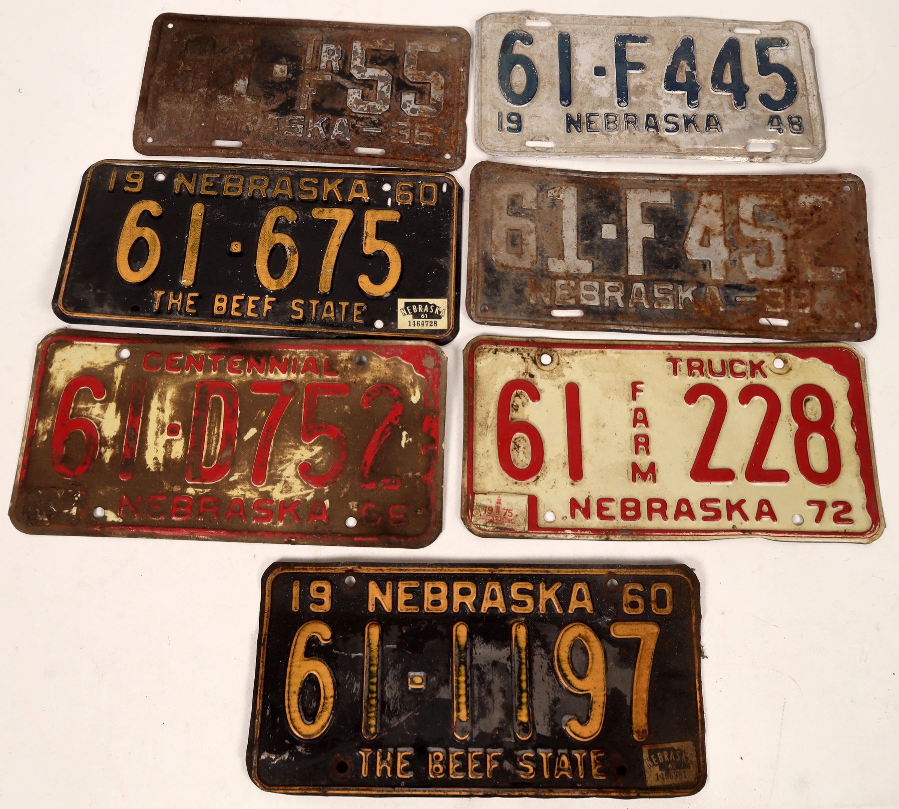7 Nebraska license plates, regular, farm, farm truck and D. 1939,1938, 1948, 2x 1960, 1966, 1972. Some rust and dents, please inspect. Nebraska