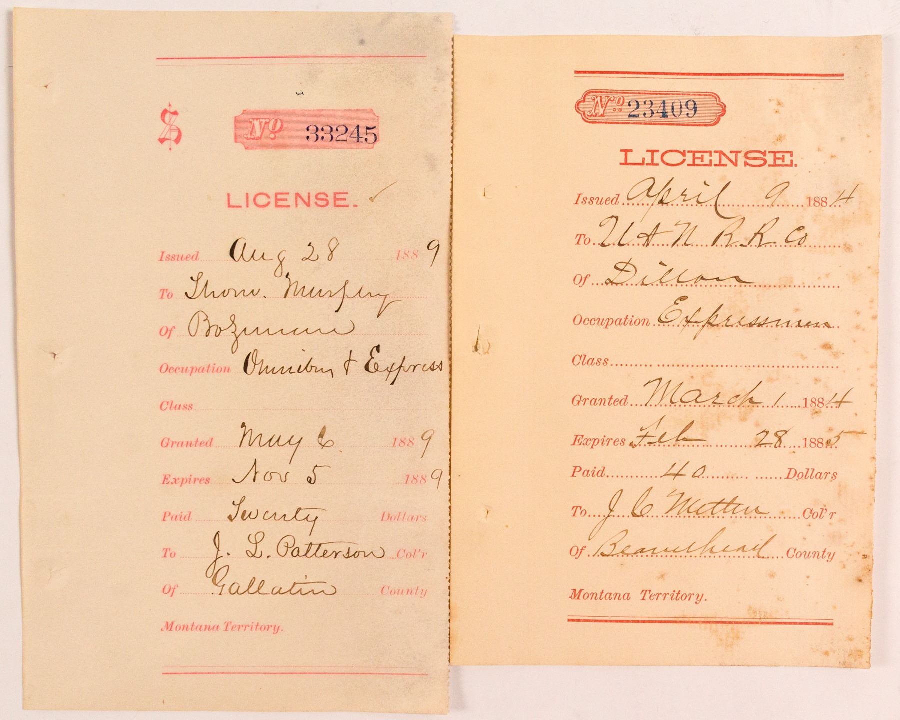 1) 1884 license receipt issued 1884 in Dillon to Utah & Northern Railroad Expressman. 2) 1889 license receipt for Omnibus & Expressman in Bozeman. 6.25" x 4" Soiling