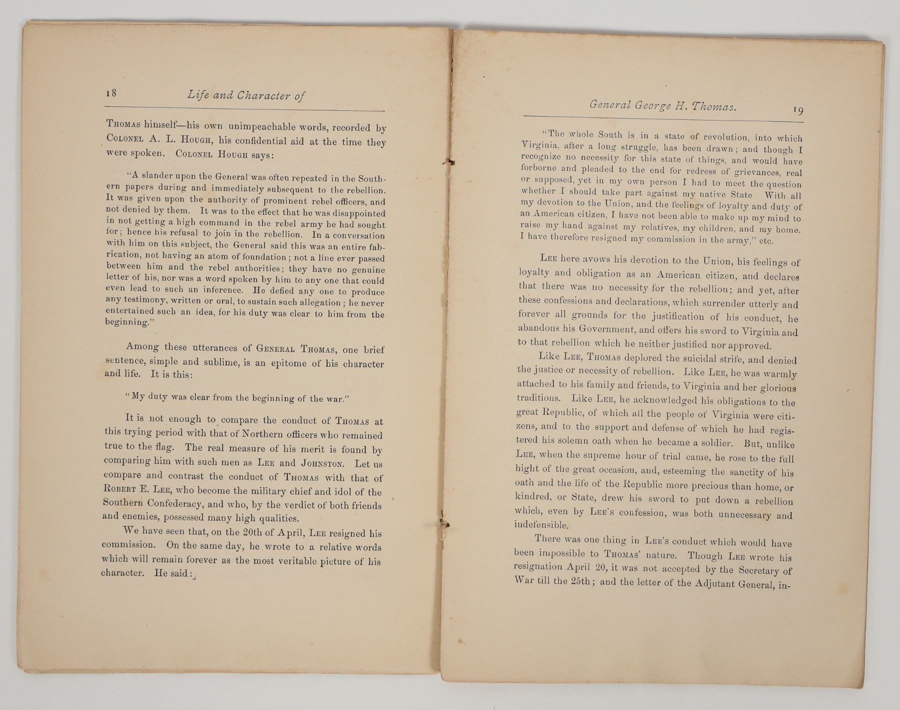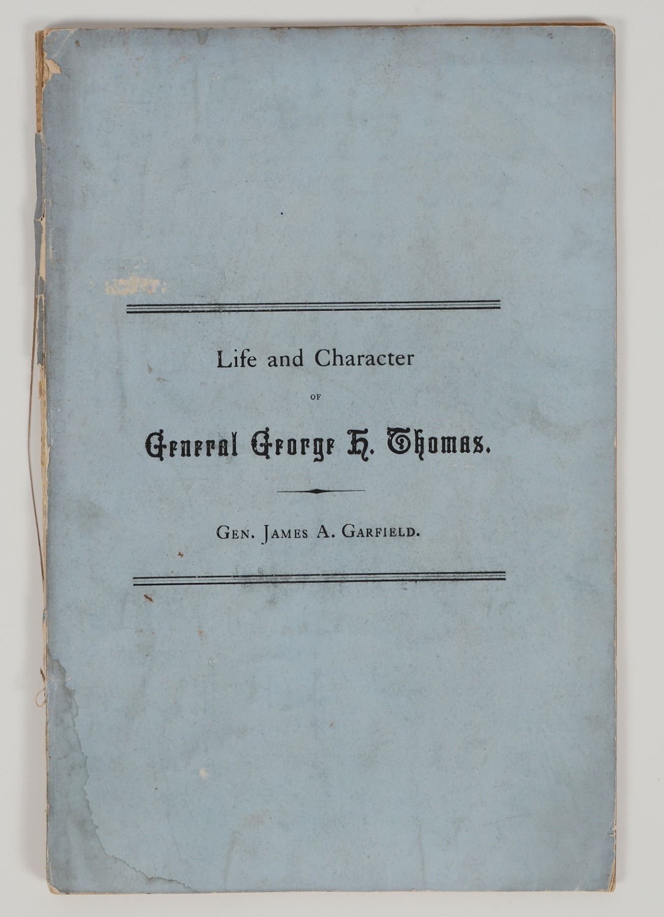Life And Character Of General George H. Thomas a speech delivered by General James A. Garfield ( Later President). before the Society of the Army of the Cumberland, Fourth Annual Reunion. Gen. Thomas was a southerner who decides to join the Union Army against family wishes. He was well respected and leader during his tenure. Fragile condition., back cover missing, 50 pages but could be missing one .