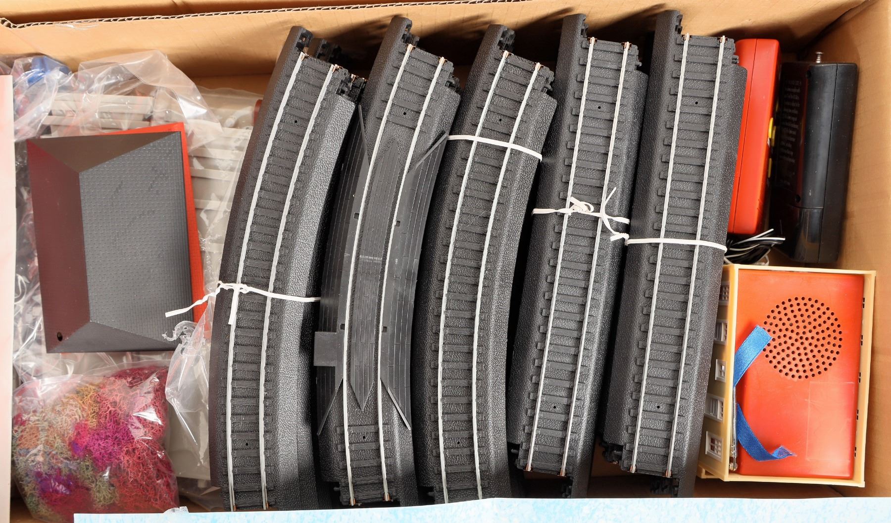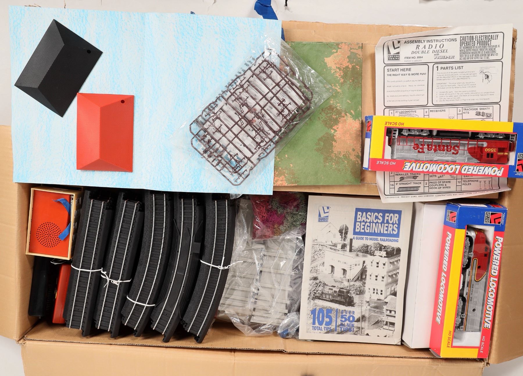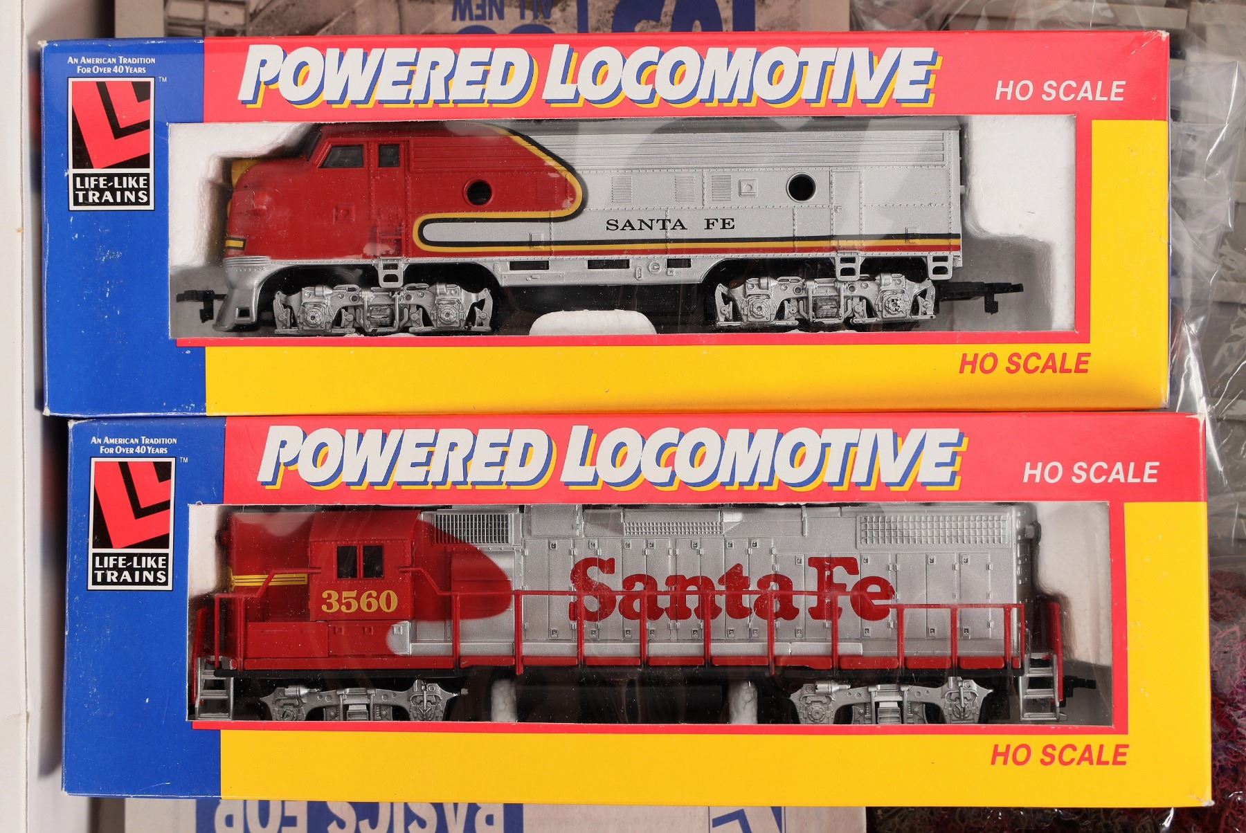 Life Like HO Double diesel radio controlled train set. This is in factory NIB, complete with Sant Fe Twin diesels, rolling stock (still in boxes), landscape material : buildings, roll out grass and track, track, control handhelds. Long term storage, untested.