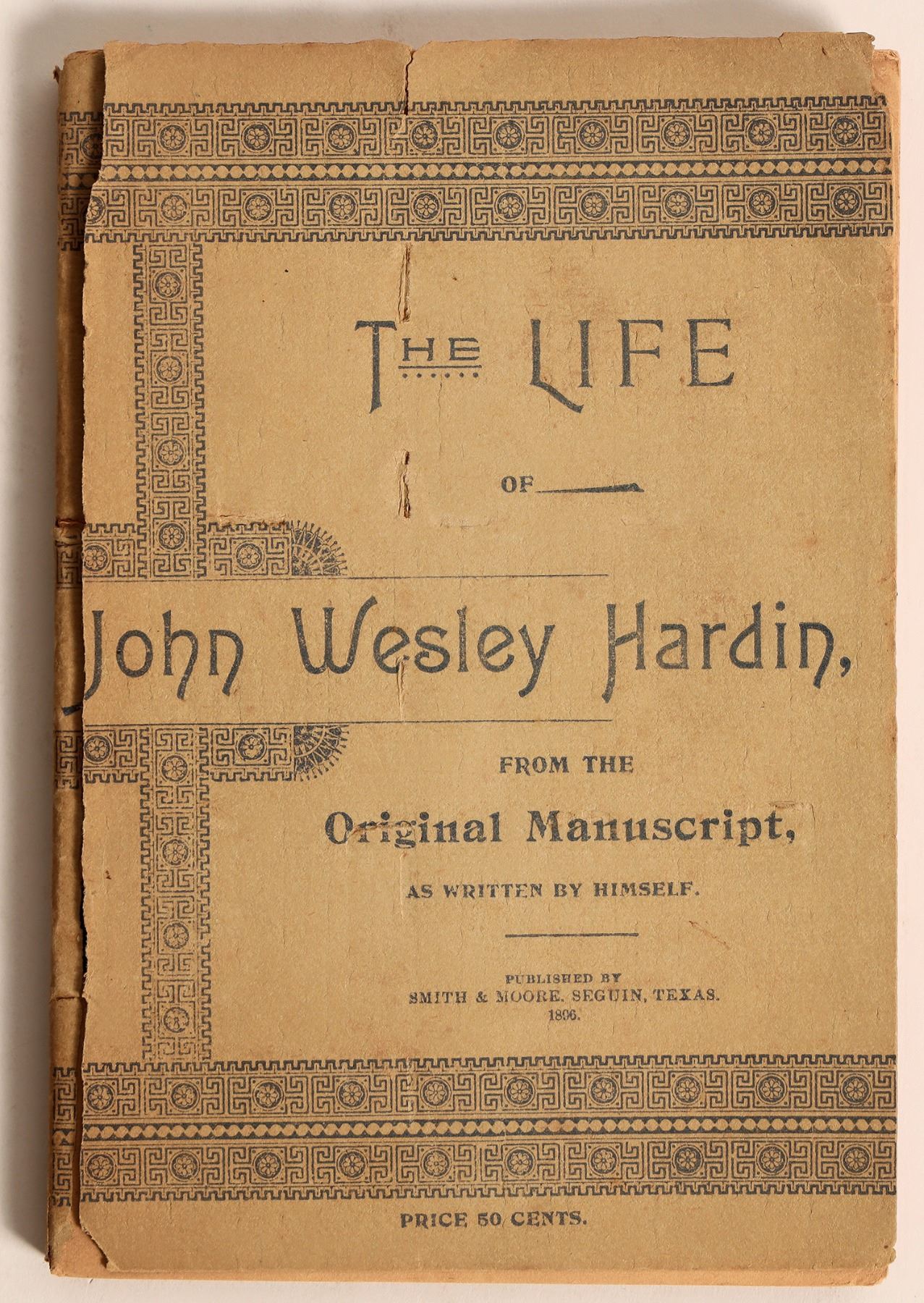 First edition of The Life Of John Wesley Hardin" from the Original Manuscript as written by himself. Published by Smith & Moore, Seguin Texas, 1896. John Wesley Hardin was a famous old west outlaw who killed his first victim at the age of 15 and eventually was sentenced for the murder of 27 men. From prison he wrote his autobiography. He was shot in the back of the head in El Paso by a policeman he had had a feud with. 144 pages with illustrations. Front page is separated and light tears of corners. Otherwise good condition. Has a protective plastic cover. 7.25x5 inches. Comes with a certificate of authentication. [