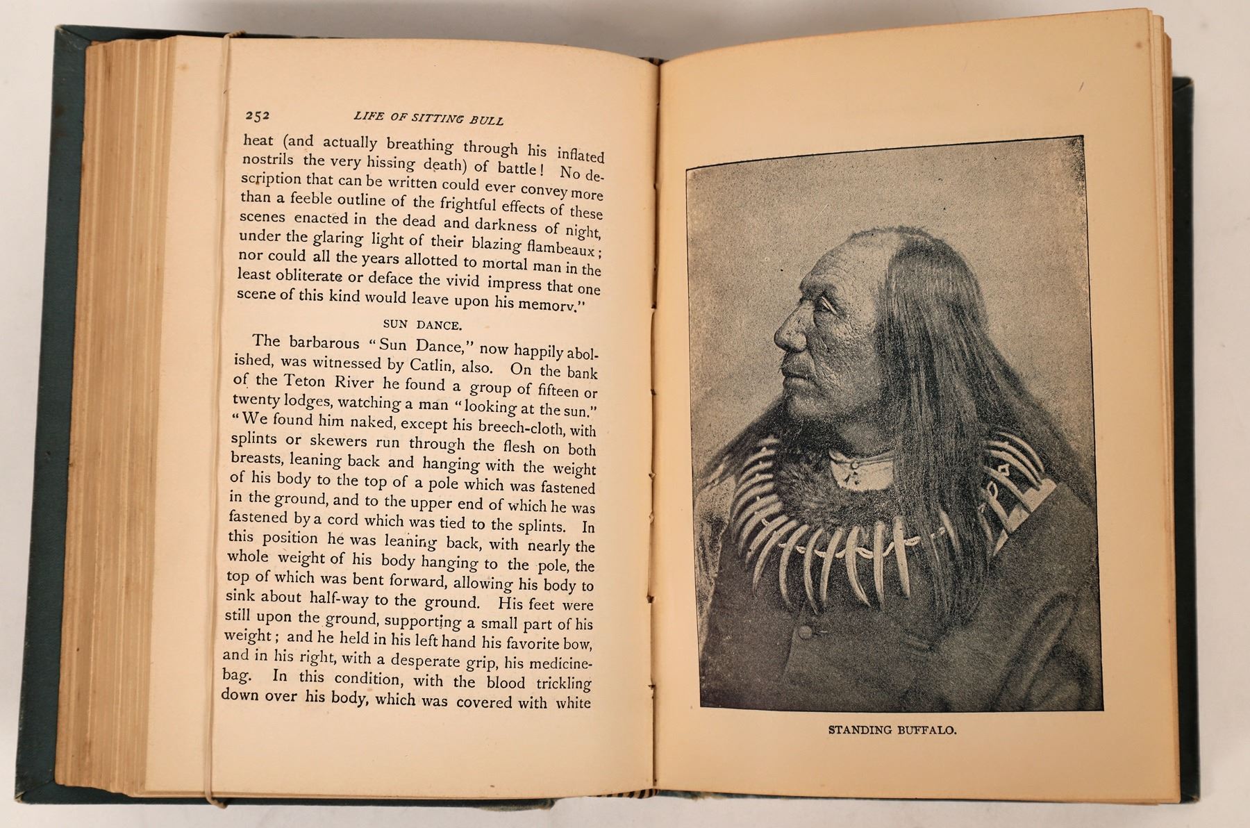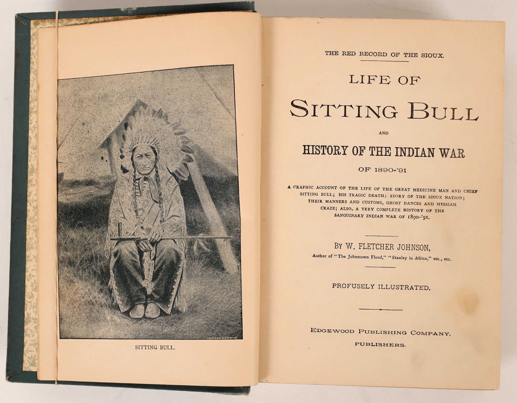 "Life of Sitting Bull & History of the Indian War 1890-1891" by W. Fletcher Johnson. The title page reads that it is "Profusely Illustrated." Boards show some damage and there is separation from the spine. 1891