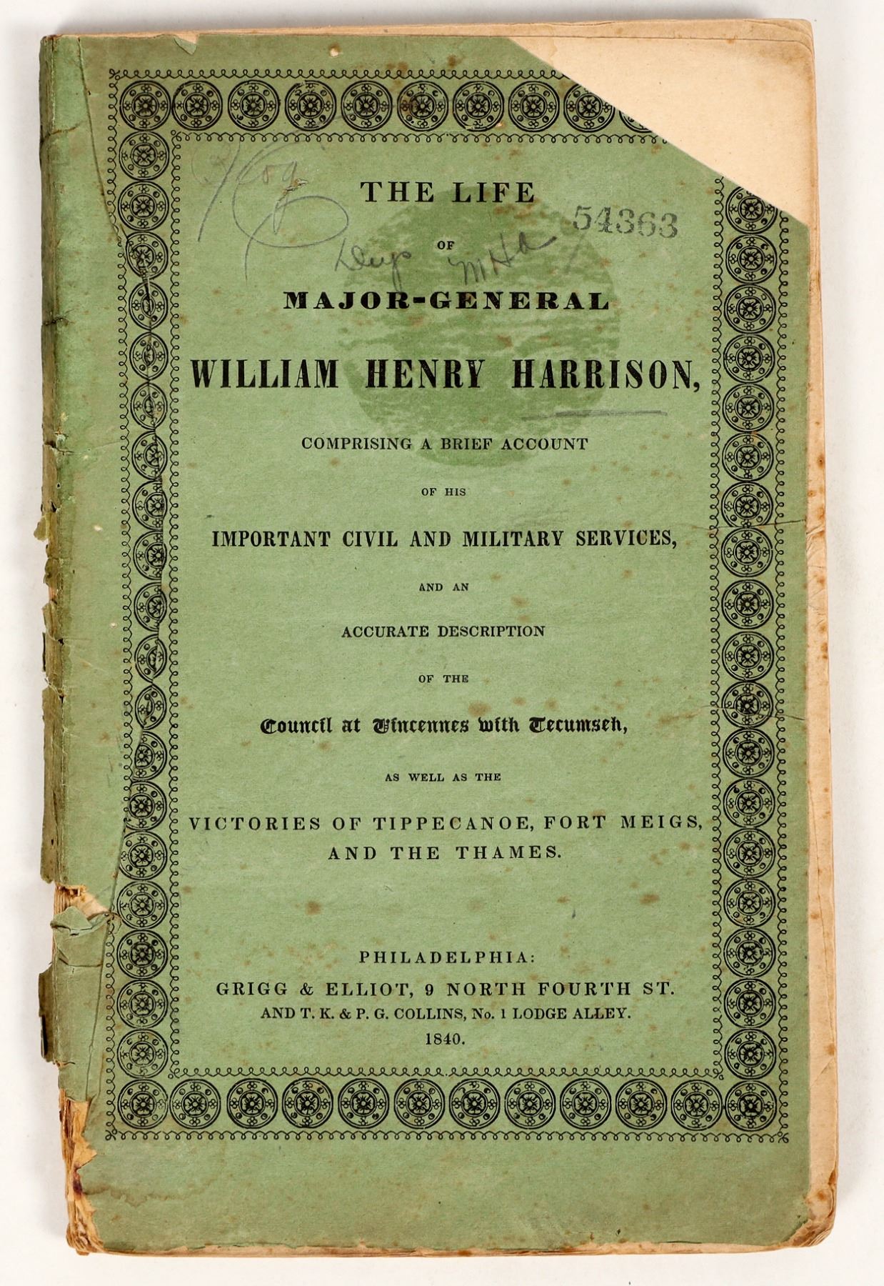 1840 The Life Of William Henry Harrison. 96 pages, paperback, Harrisons war career, including the council at Vincennes with Tecumseh and his victories at Tippecanoe, Fort Megs and the Thames. Book served Harrison as part of his campaign for President.