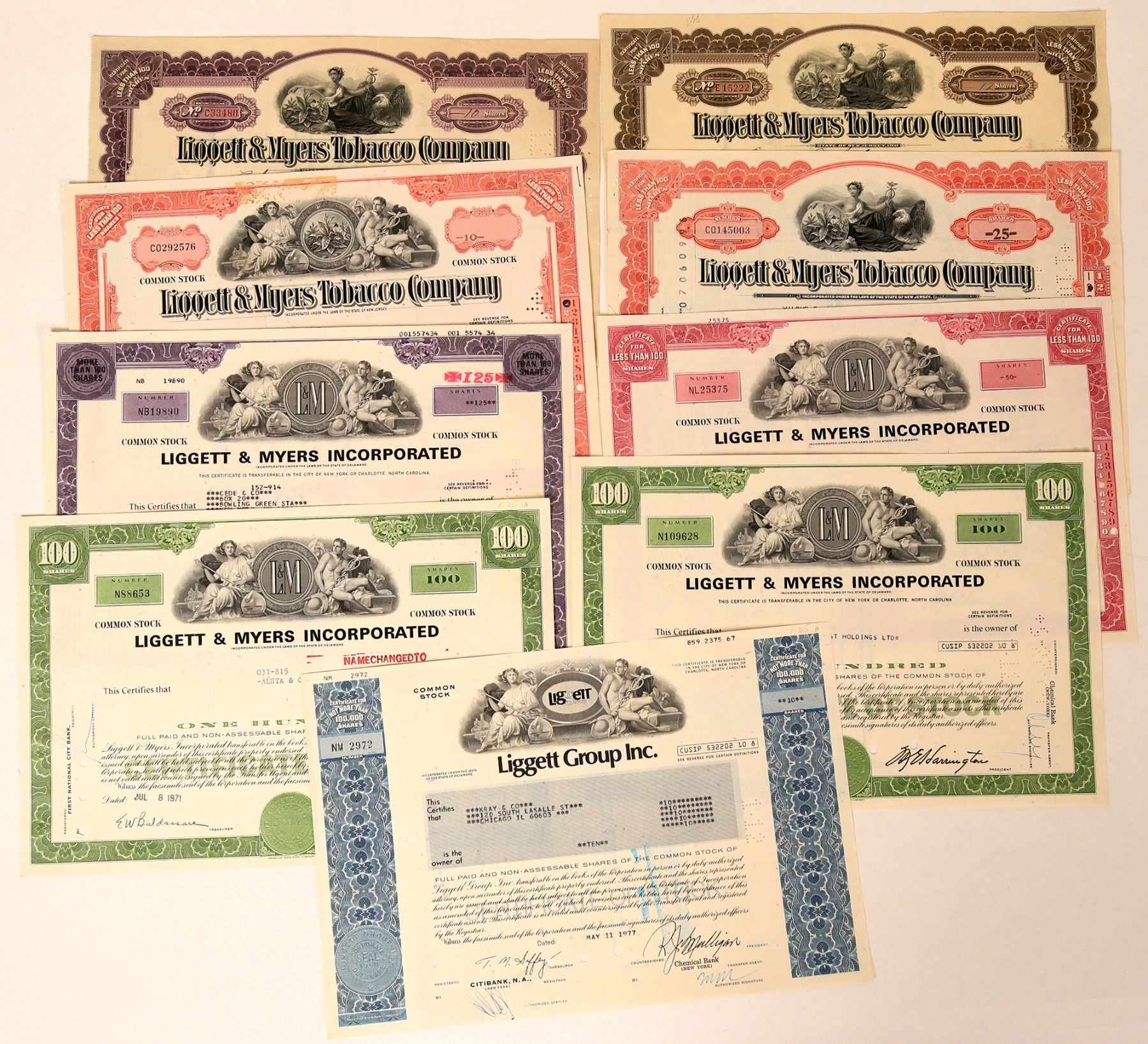 Lot of nine. Includes purple and brown 1926 stocks. Older stocks are reddish orange, red, purple green and blue. All different."A partnership was formed between John E Liggett and George Smith Myers of Missouri, and in 1873 The Liggett & Myers Tobacco Company was incorporated. In 1876, Liggett & Myers introduced L&M plug chewing tobacco, during the 1880s it entered the cigarette business and by 1885 the company had become the world's largest manufacturer of plug chewing tobacco...Today the Liggett Group, formerly known as Liggett & Myers Tobacco Company, is the fourth largest tobacco company in the United States. Its headquarters are located in Durham, North Carolina, though its manufacturing facility is 30 miles to the west in Mebane, North Carolina." [wikipedia]