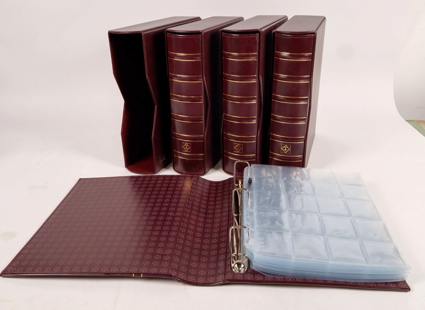 Four burgundy Lighthouse Classic Grande collectors albums with three inch binders with slipcovers and 68 pages of plastic (BCW) pages each with twenty spots for 2 x 2s. Hand-made binder in bookbinder's quality. Leatherette cover with matching slipcase. Sturdy 3 D-ring mechanism. The 9x12" size is perfect for a wide range of pages (for slabs, 2x2"s, QUADRUM, encapsulated coins) and stock sheets (for stamps, bank notes, postcards, covers) incl. GRANDE and VARIO sheets. Holds up to 60 stock sheets depending on contents. Overall size or each album: 11 1/2 x 13 1/4 x 2 3/4" (293 x 335 x 70 mm).