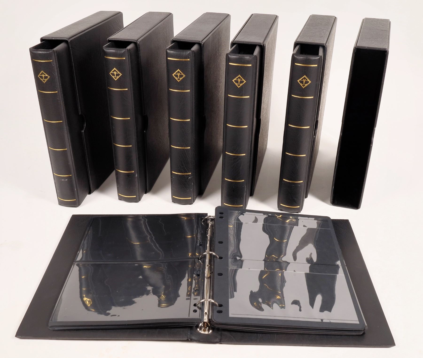 Six black Lighthouse Collectors albums. Three ring binders with slipcovers and 146 pages with four pockets for postal covers or currency. Slipcovers measure 10 x 12 1/2 x 2 1/2 inches.
