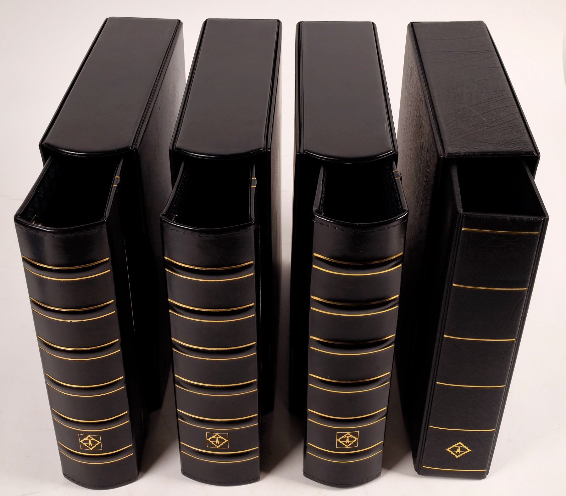 Four black Lighthouse large three-inch Vario G ("Gigant") binder with capacity for 60-80 Vario sheets depending on contents. Three D-rings hold the pages securely in place. The attractive textured leatherette cover and slipcase feature gold foil graphics. Outside Dimensions: 10 7/8 x 12 1/2 x 3 1/4 inches (275mm x 318mm x 83mm). No pages included. One is slightly different than the other three, but the same size.