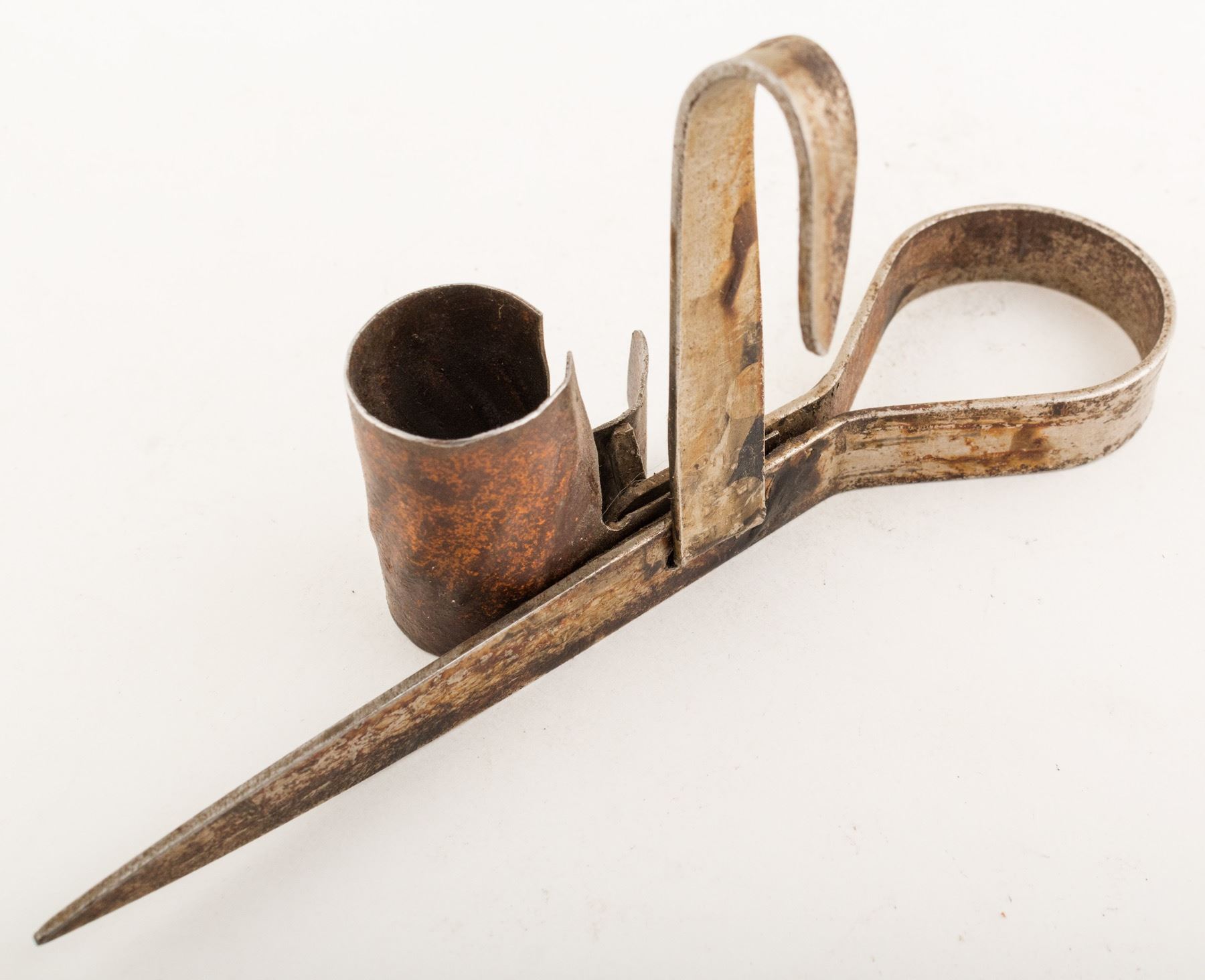 A manufactured mechanical candlestick. This candlestick may be the end of the candlestick era, made of lightweight steel probably in the 1920s. Not seen before by the author. State: City: HWAC#: 47276 Date:
