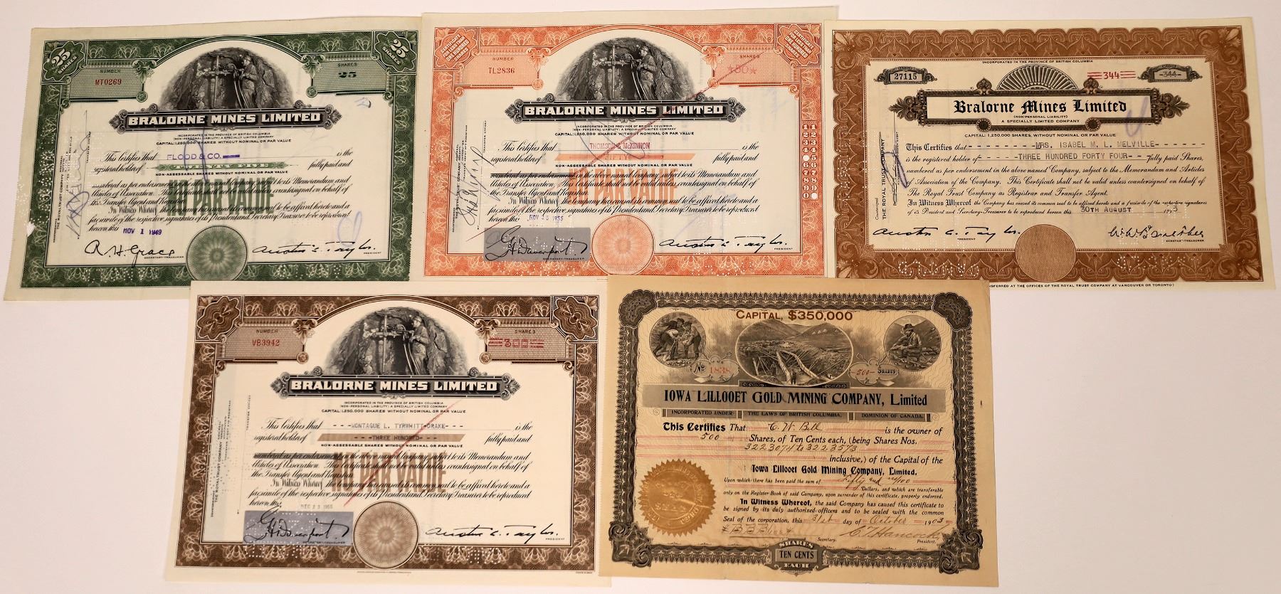 Lot of five. 1) Lillooet Gold Mining Company. #1838 issued in 1903. 2) Bralone Mines Limited. Issued in 1935. Located 80 miles west of Lillooet. Although in service for many decades, the 1930's were the most prosperous. 3) Bralone Mines. 1949. Green. 4) Bralone Mines 1955 orange. 5) Bralone Mines 1955