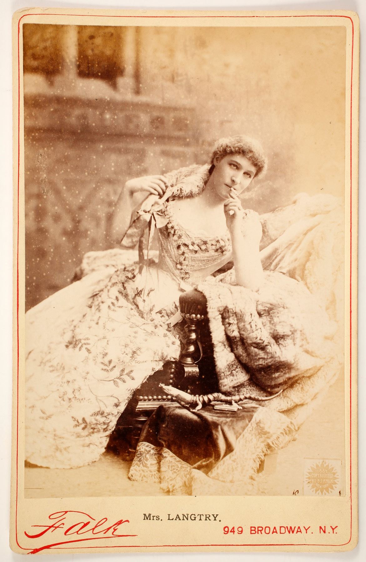 Mounted photo of Lilly Langtree by Falk of NY. 5.75x4". "Emilie Charlotte Langtry (née Le Breton; October 13, 1853 – February 12, 1929), known as Lillie (or Lily) Langtry and nicknamed "The Jersey Lily", was a British-American socialite, actress and producer. Born on the island of Jersey, upon marrying she moved to London in 1876. Her looks and personality attracted interest, commentary, and invitations from artists and society hostesses, and she was celebrated as a young woman of great beauty and charm. By 1881, she had become an actress and starred in many plays in the UK and the United States, including She Stoops to Conquer, The Lady of Lyons, and As You Like It, eventually running her own stage production company. In later life she performed "dramatic sketches" in vaudeville. She was also known for her relationships with noblemen, including the Prince of Wales, the Earl of Shrewsbury, and Prince Louis of Battenberg. She was the subject of widespread public and media interest." from wikipedia. Mackie Collection