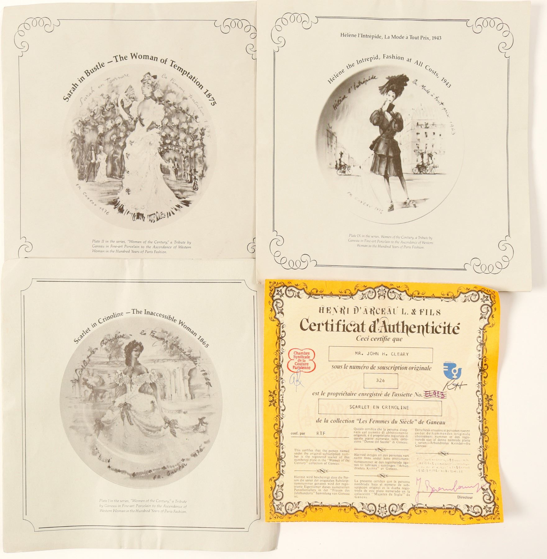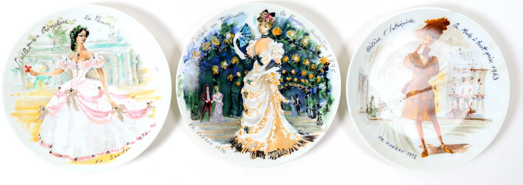 3 ladies on plates, 8.25", brown attired lady is broken and glued, 2 others ok