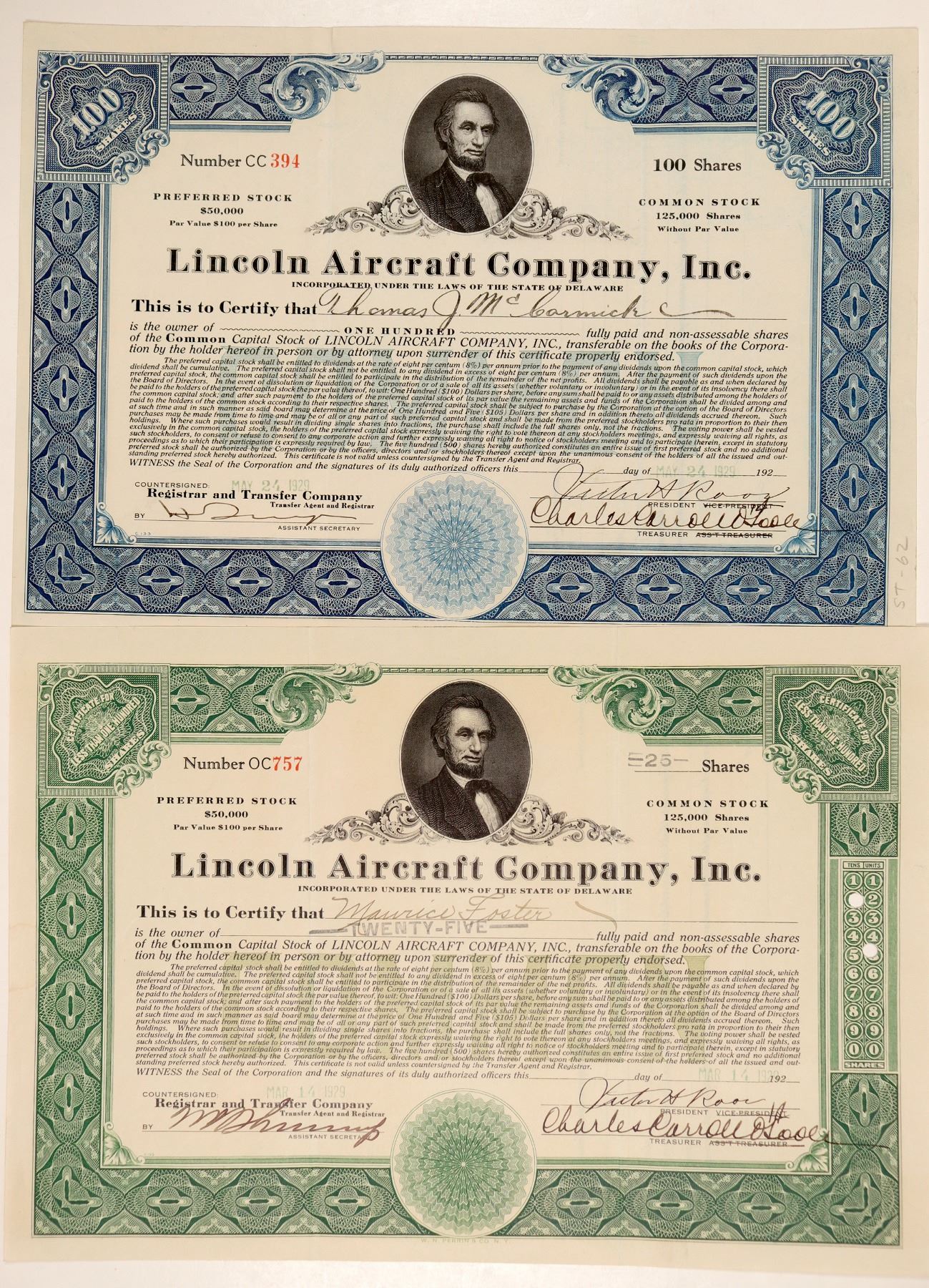 Lot of 2 different varieties. No. OC757, issued to Maurice Foster in 1929 for 25 shares. No. CC394, issued to Thomas J. McCormick for 100 shares in 1929. Neither cancelled. Signed by president Victor Roos and treasurer Charles O'Toole. Green or blue borders, portrait vignette of Abraham Lincoln. Printed by W.N. Perrin & Co., NY. 8 x 11" Folds, pinholes. In 1931, the Lincoln-Page Aircraft Company purchased the American Eagle Aircraft Corporation, which had begun producing airplanes in Kansas in 1925 but didn't survive through the Great Depression. This new merger also failed during the Depression. Roos founded the short lived Victor H. Roos Aircraft Company to continue to sell the American Eaglet design. Roos had invested in/managed many early aircraft companies including Cessna, the Roos-Bellanca company, the Swallow Airplane Company, the Lincoln-Page Aircraft Company, and later the Automatic Coin Machine Company. Ken Prag Collection