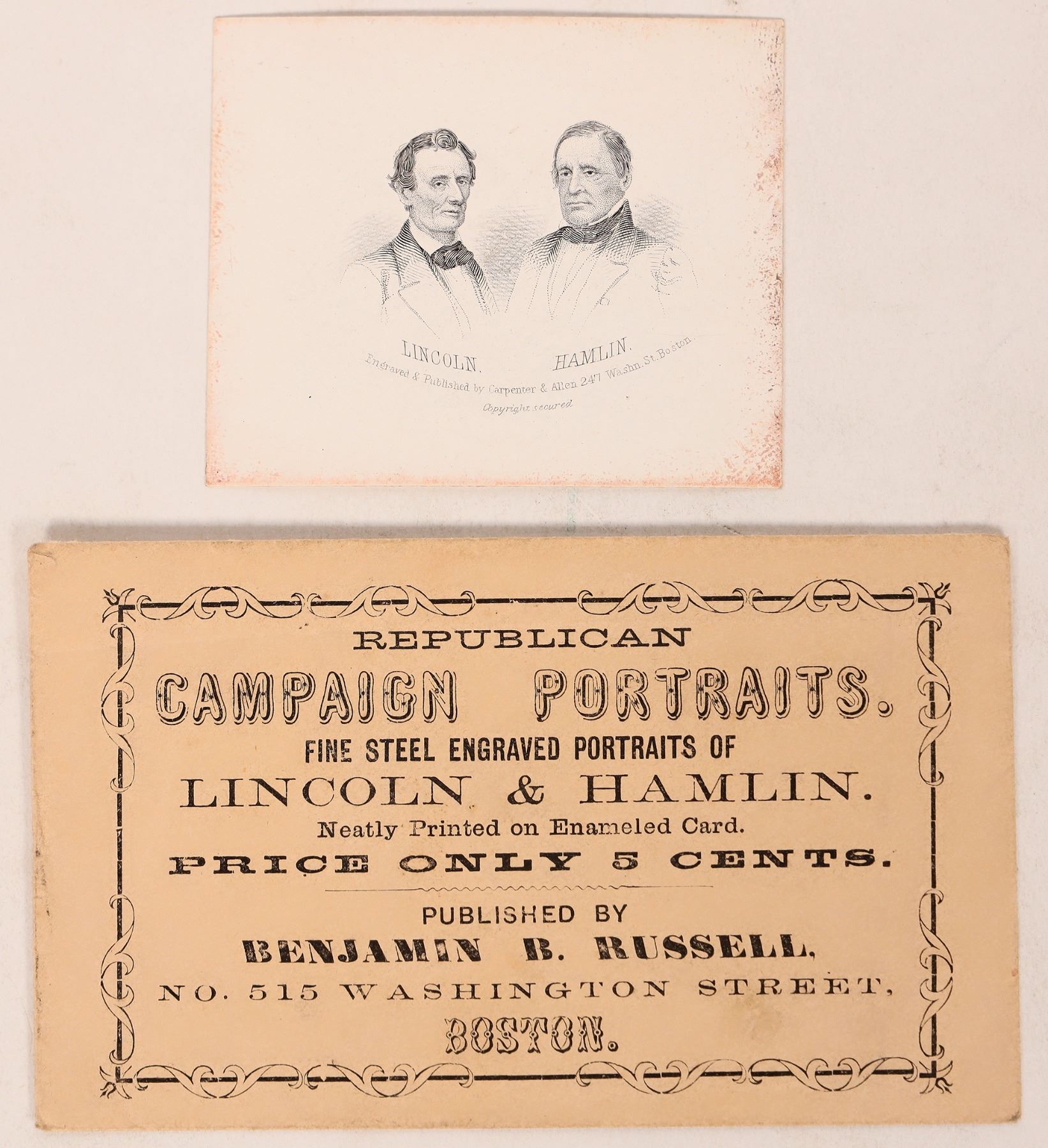 Scarce Lincoln & Hamlin 1860 campaign envelope and coated engraved jugate card. The envelope (2 1/2 x 4 1/4 inches) is in excellent condition and has the original flap on the reverse. The engraved card measures 2 x 2 1/2 inches and is in excellent condition as well. The envelope is from the Benjamin Russell Co., 515 Washington St., Boston, and the engraved card was published by Carpenter and Allen, 247 Washington St., Boston. In the 1860 general election, Hamlin balanced the Republican ticket as a New Englander partnered with the Northwesterner Lincoln. Although not a close friend of the president, he lent loyal support to his key projects such as the Emancipation Proclamation.