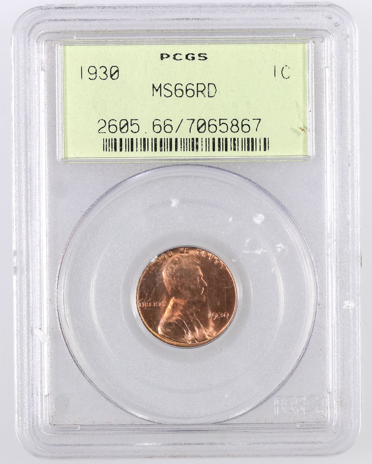 PCGS certified in an old green holder, 1930 Lincoln cent graded MS66RD[
