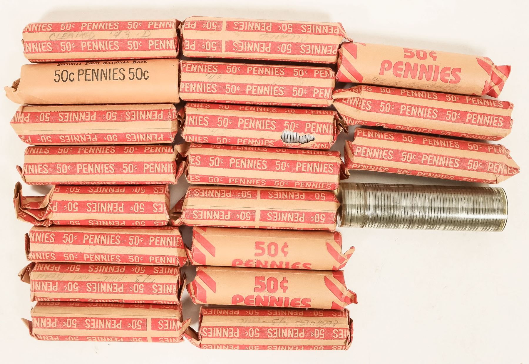 Due to a copper shortage during the World War Two year of 1943, the U. S. Mint used zinc-coated steel to make pennies. Here are almost 20 rolls of circulated 1943 cents; 19 full rolls and a partial roll. Different mint marks (D & S) included.