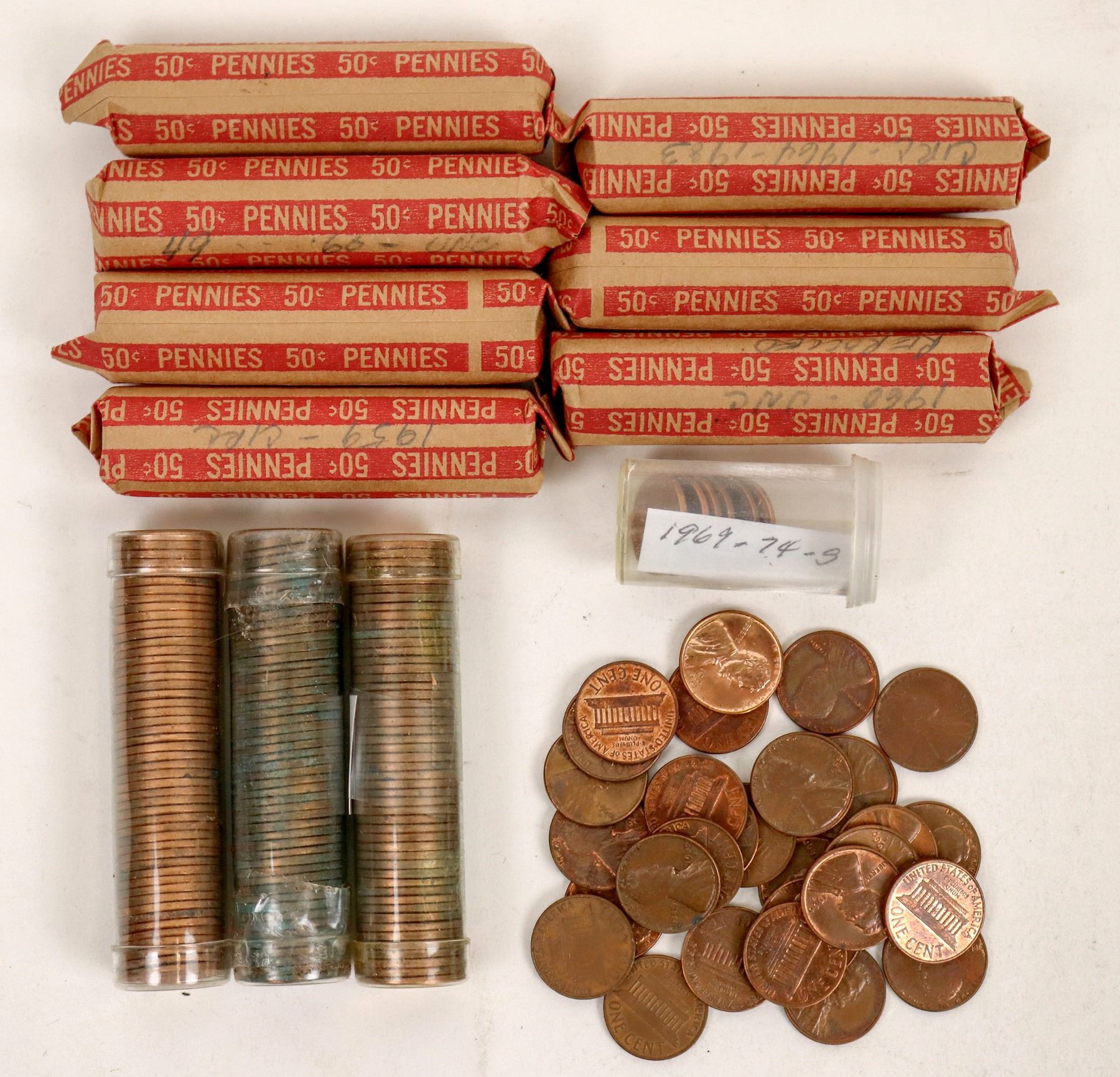 Seven rolls of BU 1960 Lincoln cents; also three miscellaneous rolls of circulated cents.