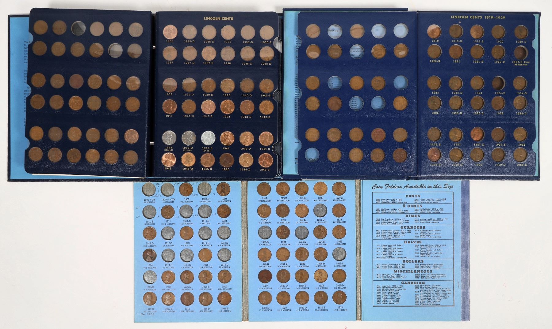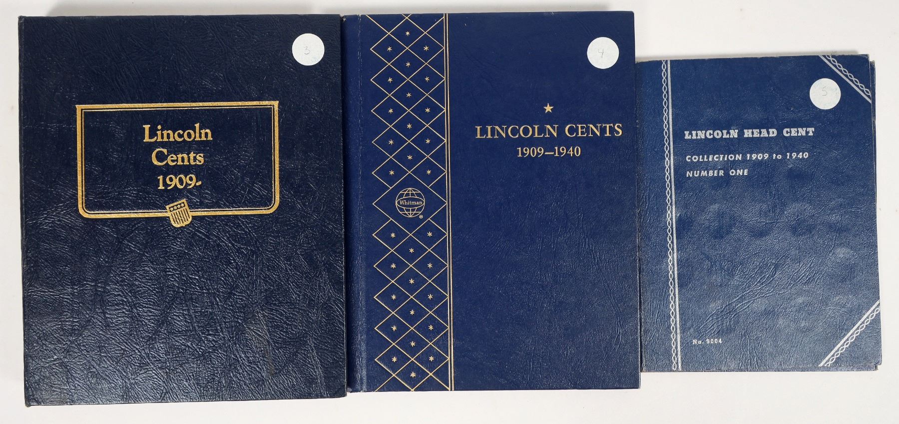 Three coin albums with Lincoln cents: 1) Blue Whitman Classic #9112; with 209 coins, missing only 1909-S VDB, 1909-S, 1914-D, 1922 (no mint mark), 1924-D, 1955 doubled die, 1972 doubled die. Dates through the early 1980s, with later coins proof and brilliant uncirculated. 2) Blue Whitman #9405 Lincoln Cents 1909-1940; with 75 coins, generally G-EF. 3) Blue Whitman #9004 Lincoln Head Cent collection 1909 to 1940 number one; with 69 coins, generally G-VF condition. Dates and mint marks have not been verified.