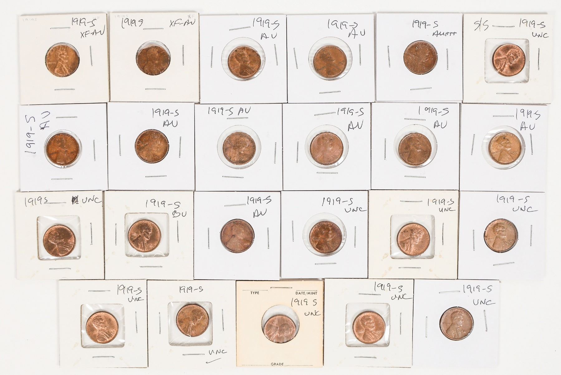 Twenty three 1919-S Lincoln cents in high grade condition: 2 XF-AU; 10 AU; 11 in BU condition. Get them certified, make some money!