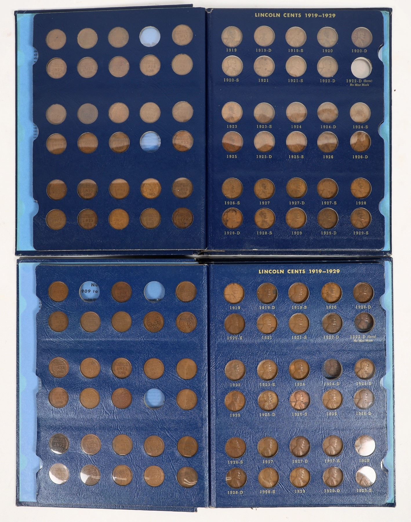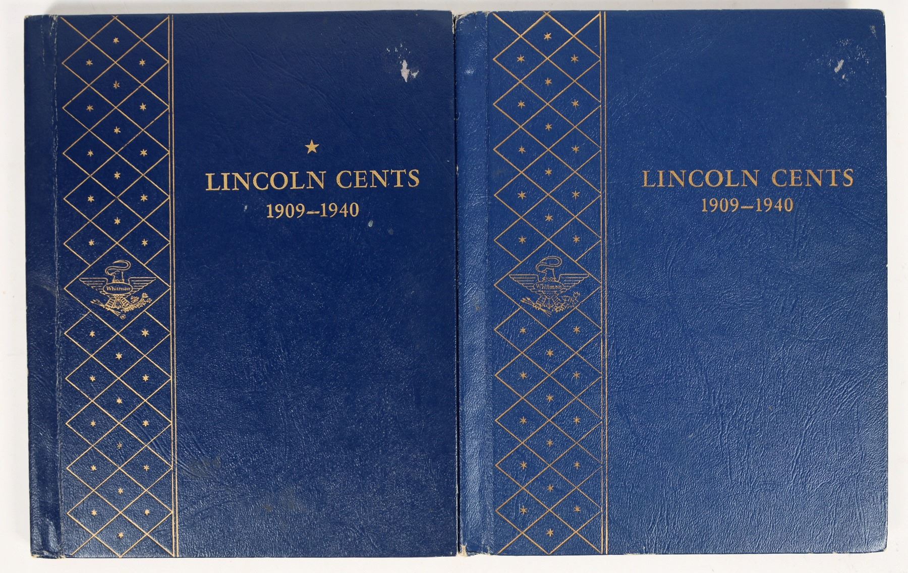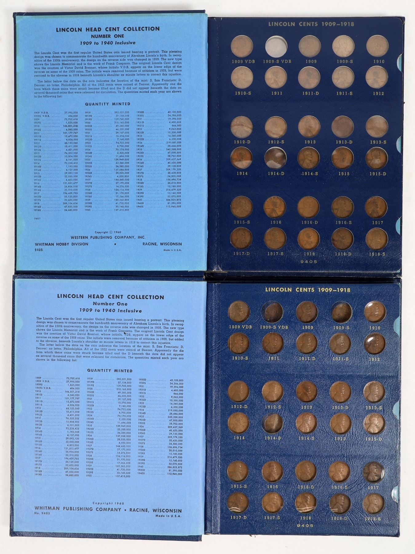 Two blue Whitman coin albums No. 9045 Lincoln Cents 1909-1940. 1) 87 coins, missing only 1909-S VDB, 1914-D, 1922 (plain), 1931-S. 2) 85 coins, missing the same four plus 1909-S, 1924-D. Dates and mint marks not verified; coins generally G-EF condition.