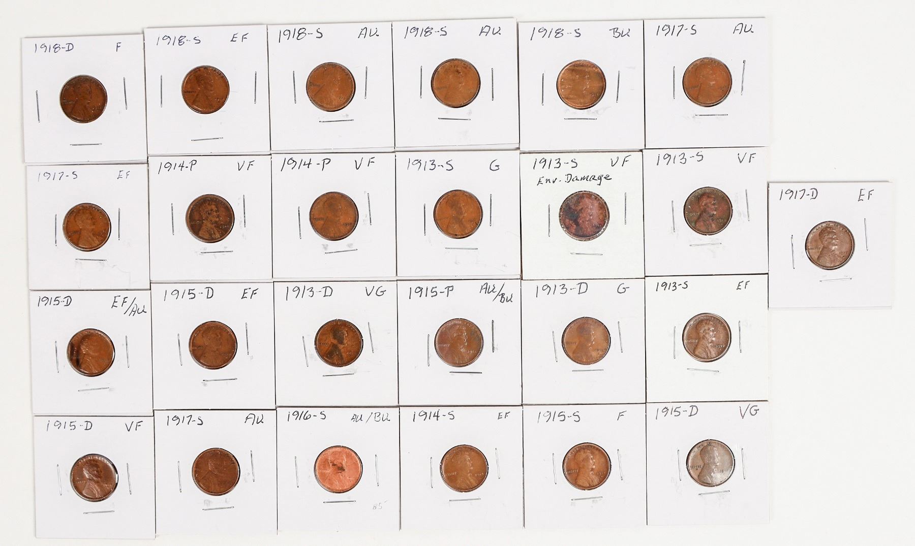 Twenty six early Lincoln cents: 1913-D (2: G, VG); 1913-S (4: G,2 VF, EF); 1914 (2: VF); 1914-S (2: G, EF); 1915 (AU); 1915-D (4: Vg, VF, EF, EF-AU); 1915-S (F); 1916-S (AU); 1917-S (3: EF, 2 AU); 1917-D (EF); 1918-S (4: EF, 2 AU, BU); 1918-D (F).