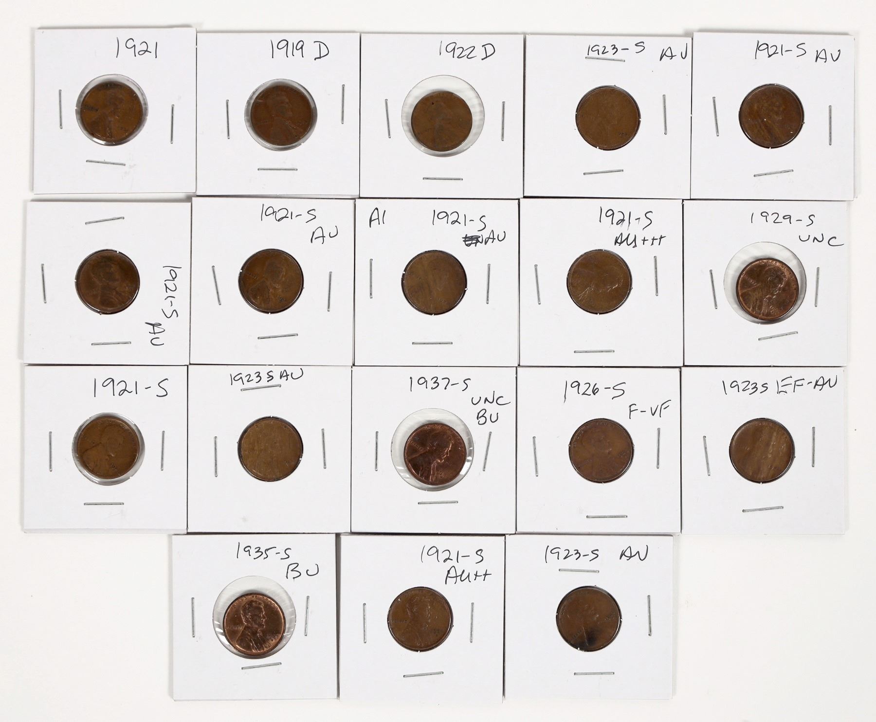 Eighteen higher grade Lincoln cents: 1919-D: EF-AU; 1921: EF-AU; 1921-S (7) AU; 1922-D: EF-AU; 1923-S (4): EF-AU; 1926-S: F-VF; 1929-S: Unc; 1935-S BU; 1937-S: Unc.